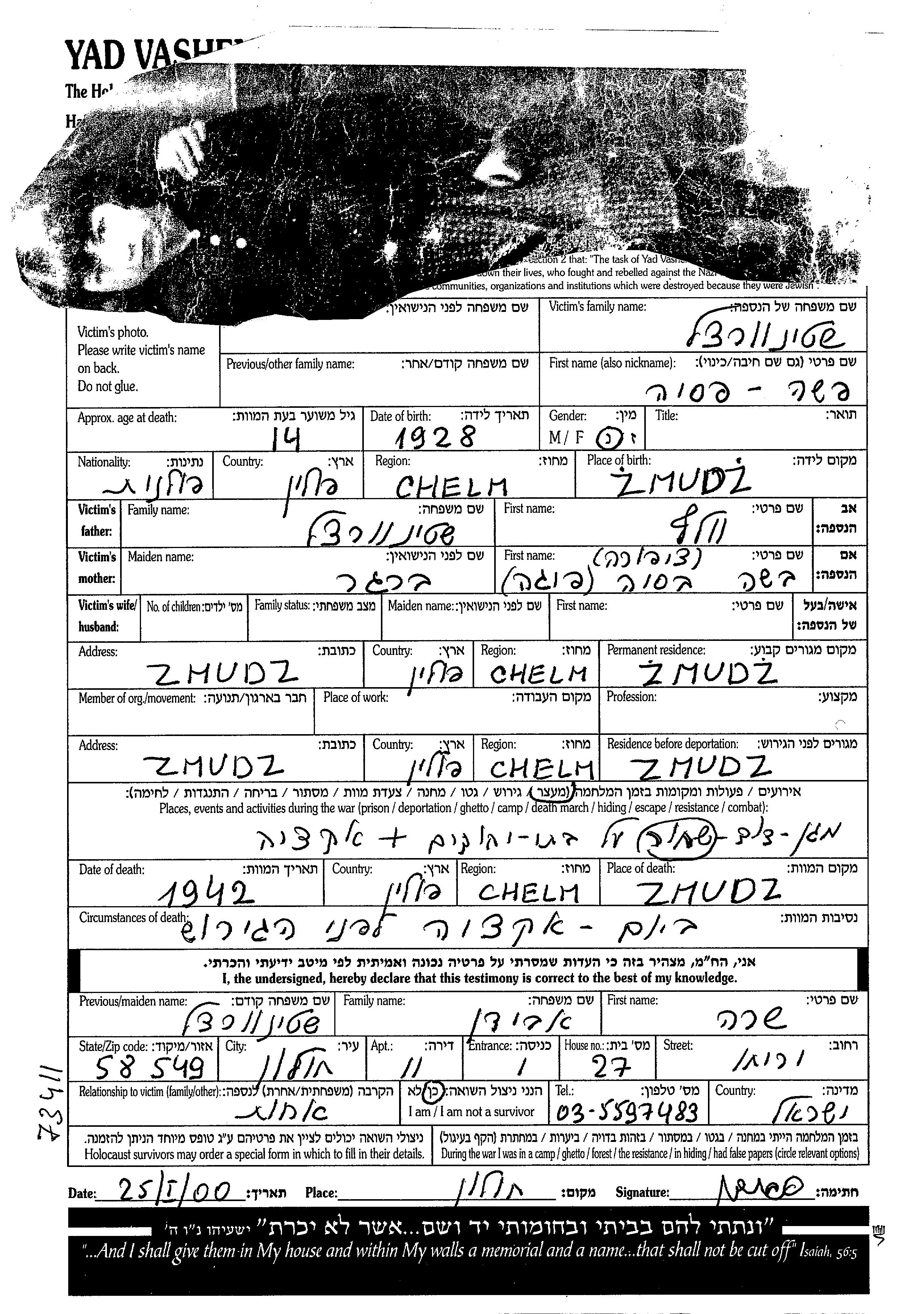 Shteinvurtzel Pasha 1928 Zmudz, Poland Page of Testimony