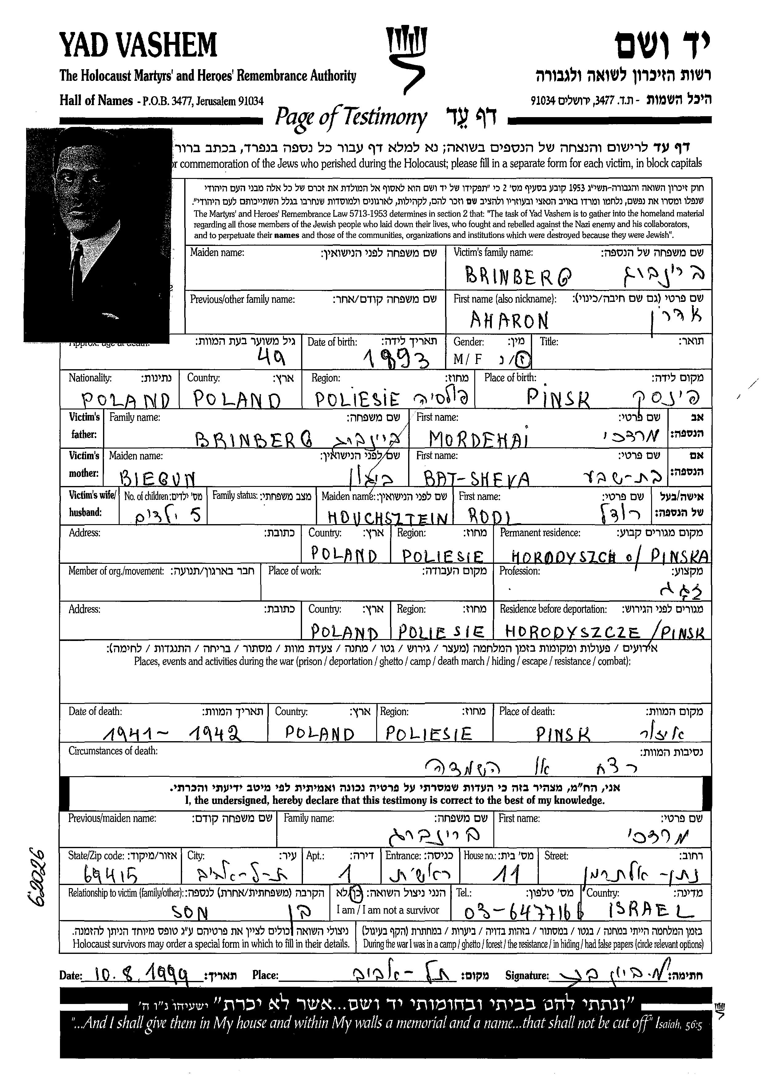Aharon Brinberg was born in Pinsk, Poland, 1893. He was a glazier. Prior to WWII he lived in Horodyszcze, Poland. Aharon was murdered in the Shoah. Place of death: Pinsk, Poland, 1941.