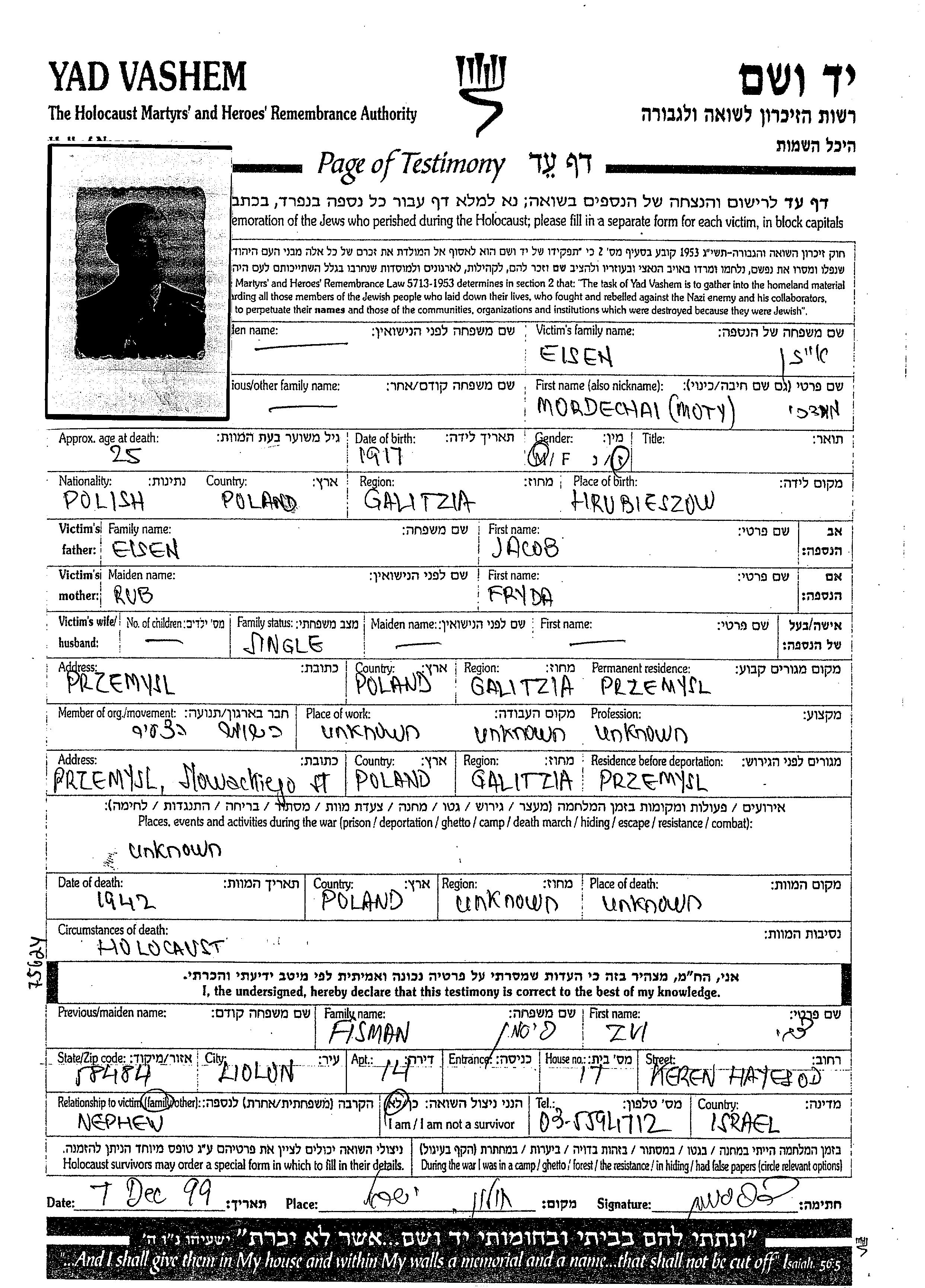 Eizen Mordechai 1917 Przemysl, Poland Page of Testimony