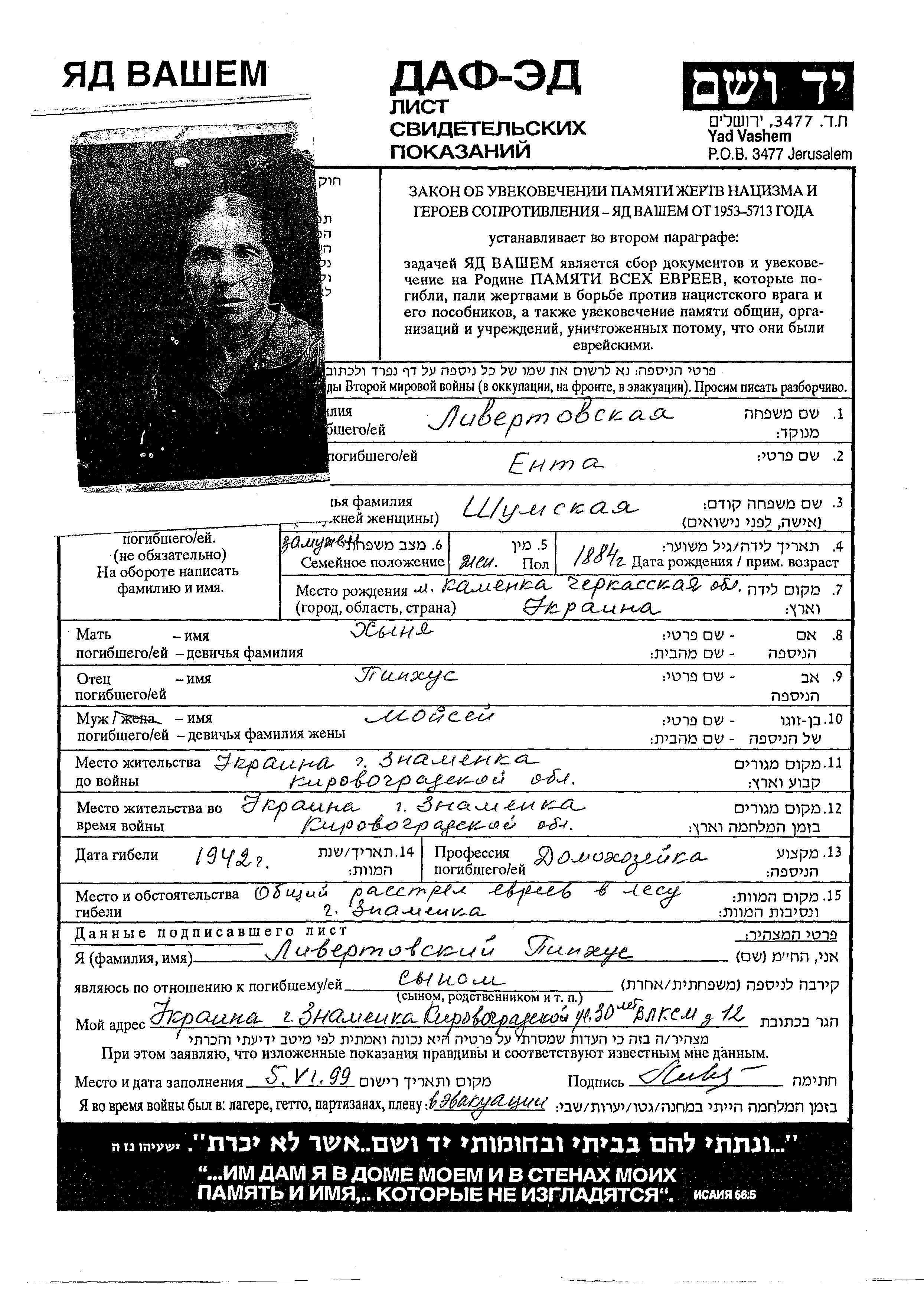 Yenta Livertovski nee Shumski was born in Kamenka, Ukraine (USSR), 1884. She was a housewife. Prior to WWII she lived in Znamenka, Ukraine (USSR). Yenta was murdered in the Shoah. Place of death: Znamenka, Ukraine (USSR), 1942.