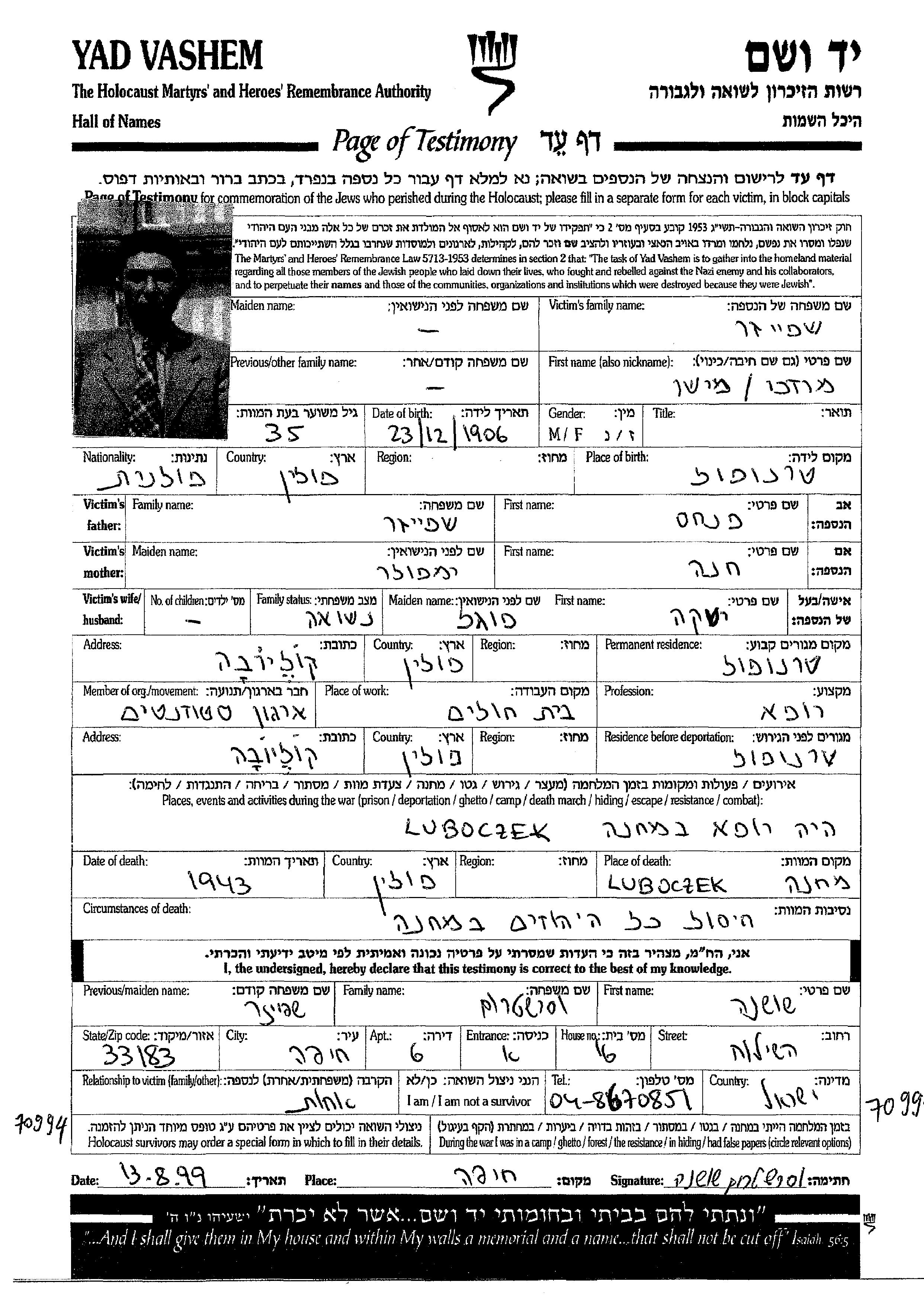 Shpeizer | Mordekhai Mishu | 1906 | Tarnopol, Poland | Page of Testimony |