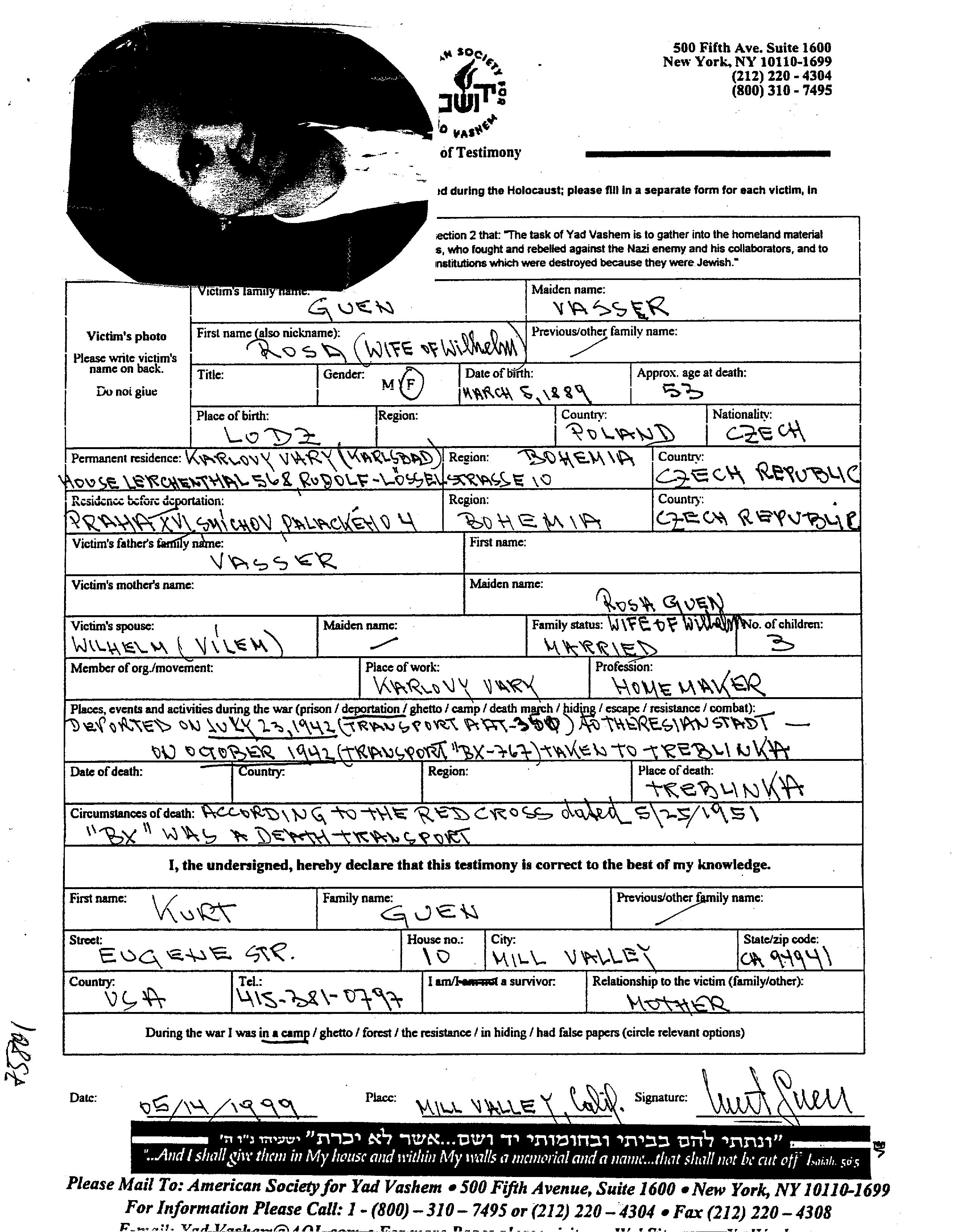 Rosa Guen nee Vasser was born in Łódź, Poland, 1889. She was a housewife. Prior to WWII she lived in Karlovy Vary, Czechoslovakia. Rosa was murdered in the Shoah. Place of death: unstated place, 1942.