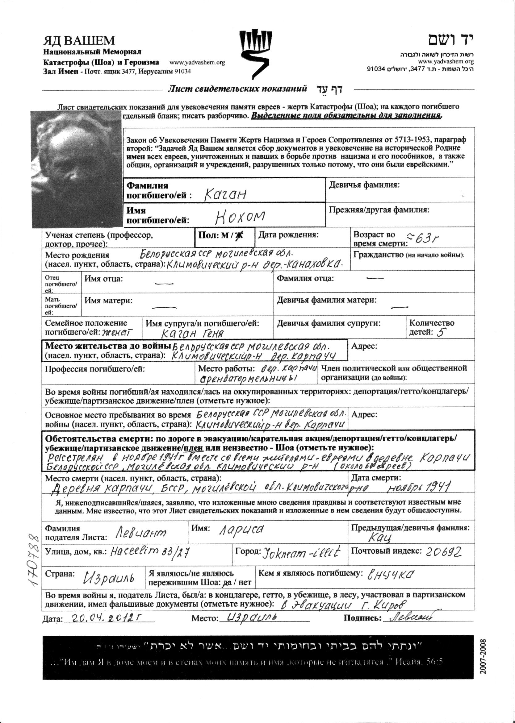 Nokhom Kagan was born in Konokhovka, Belorussia (USSR). He was a miller. Prior to WWII he lived in Karpachi, Belorussia (USSR). Nokhom was murdered in the Shoah. Place of death: Klimovichi, Belorussia (USSR), 1941.