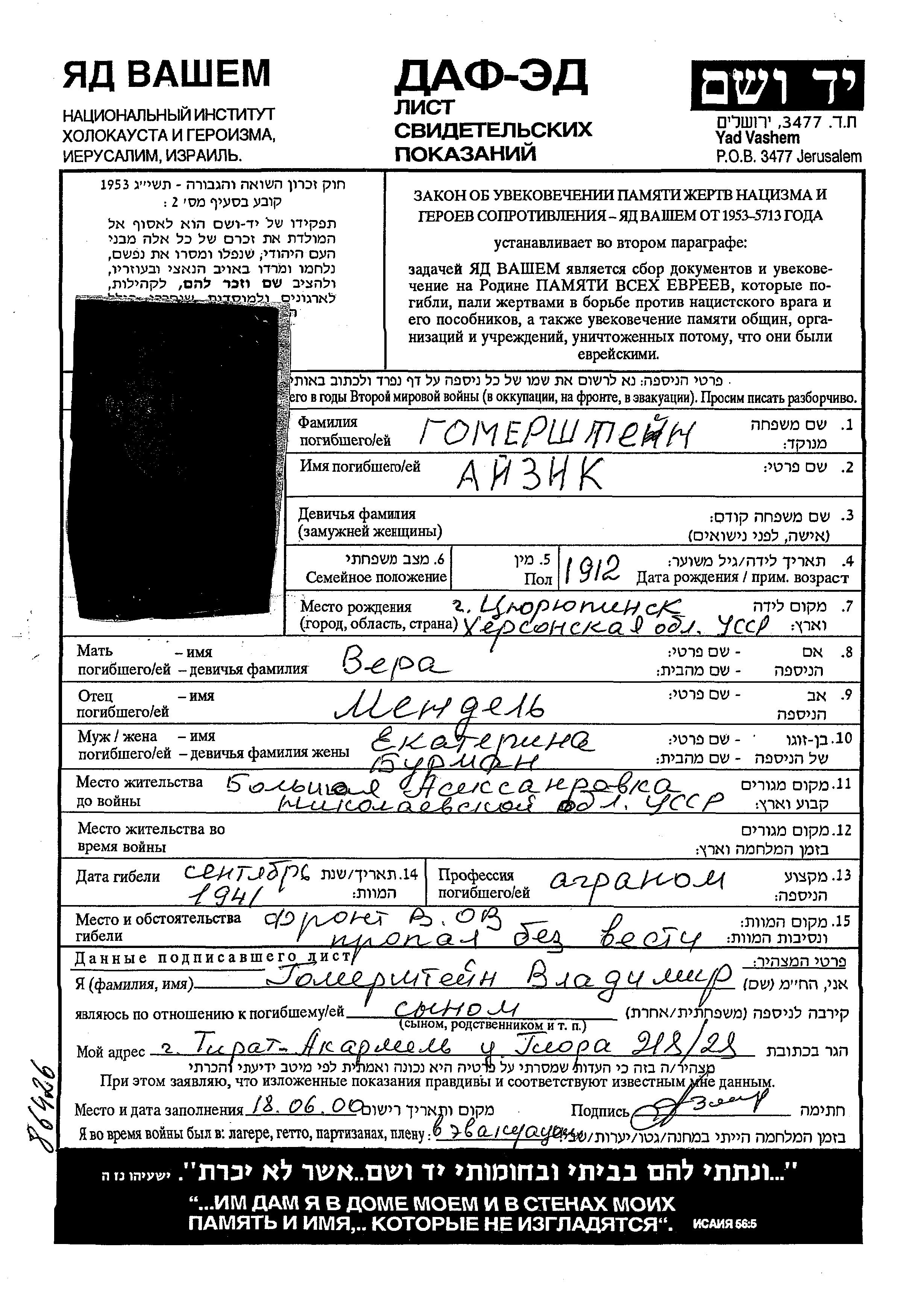 Aizik Gomershtein was born in Tsyurupinsk, Ukraine (USSR), 1912. He was an agronomist. Prior to WWII he lived in Bolshaya Aleksandrovka, Ukraine (USSR). Aizik was murdered in the Shoah. Place of death: unstated place, 1941.