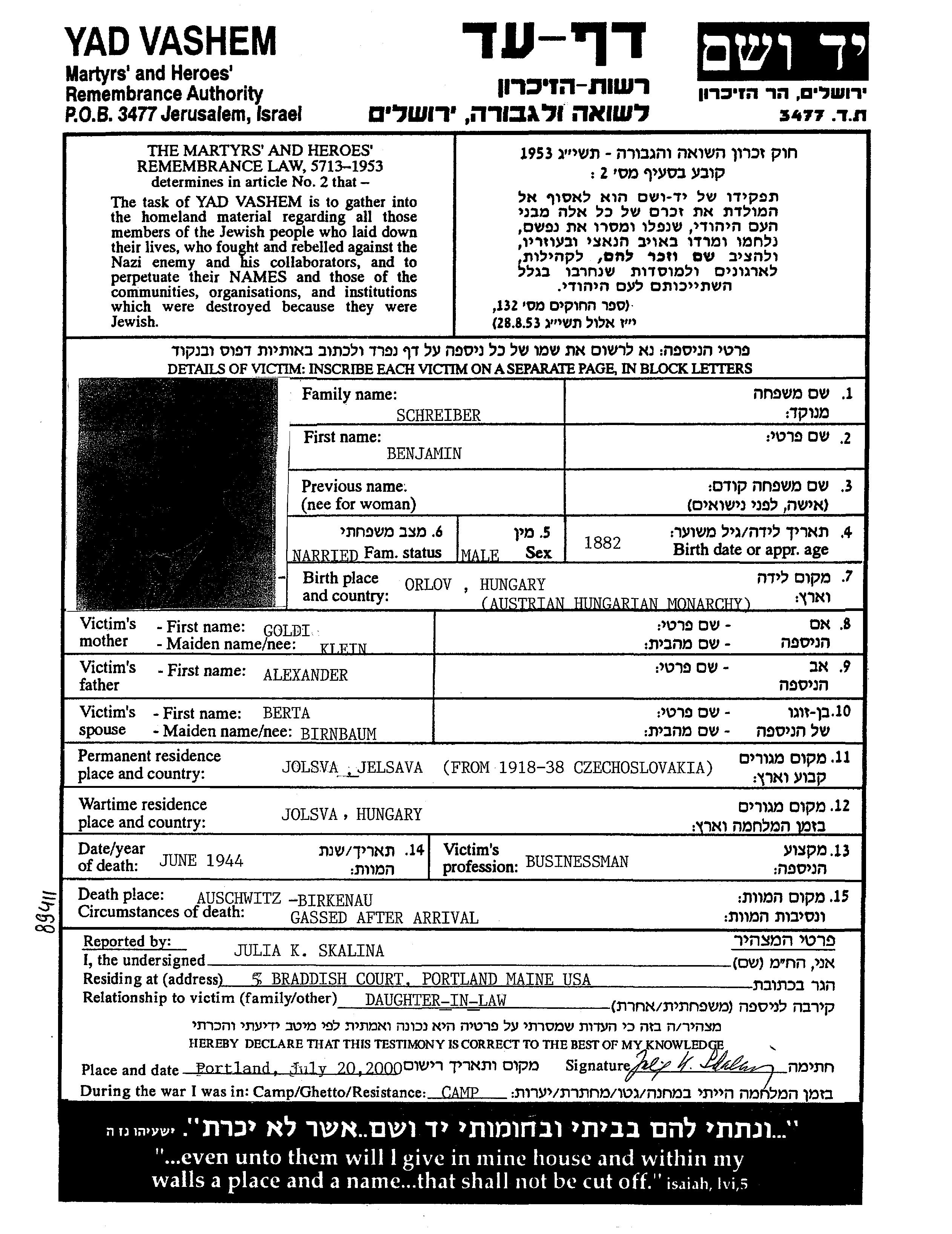 | Schreiber | Benjamin | 1882 | Jelsava, Czechoslovakia | Page of Testimony |