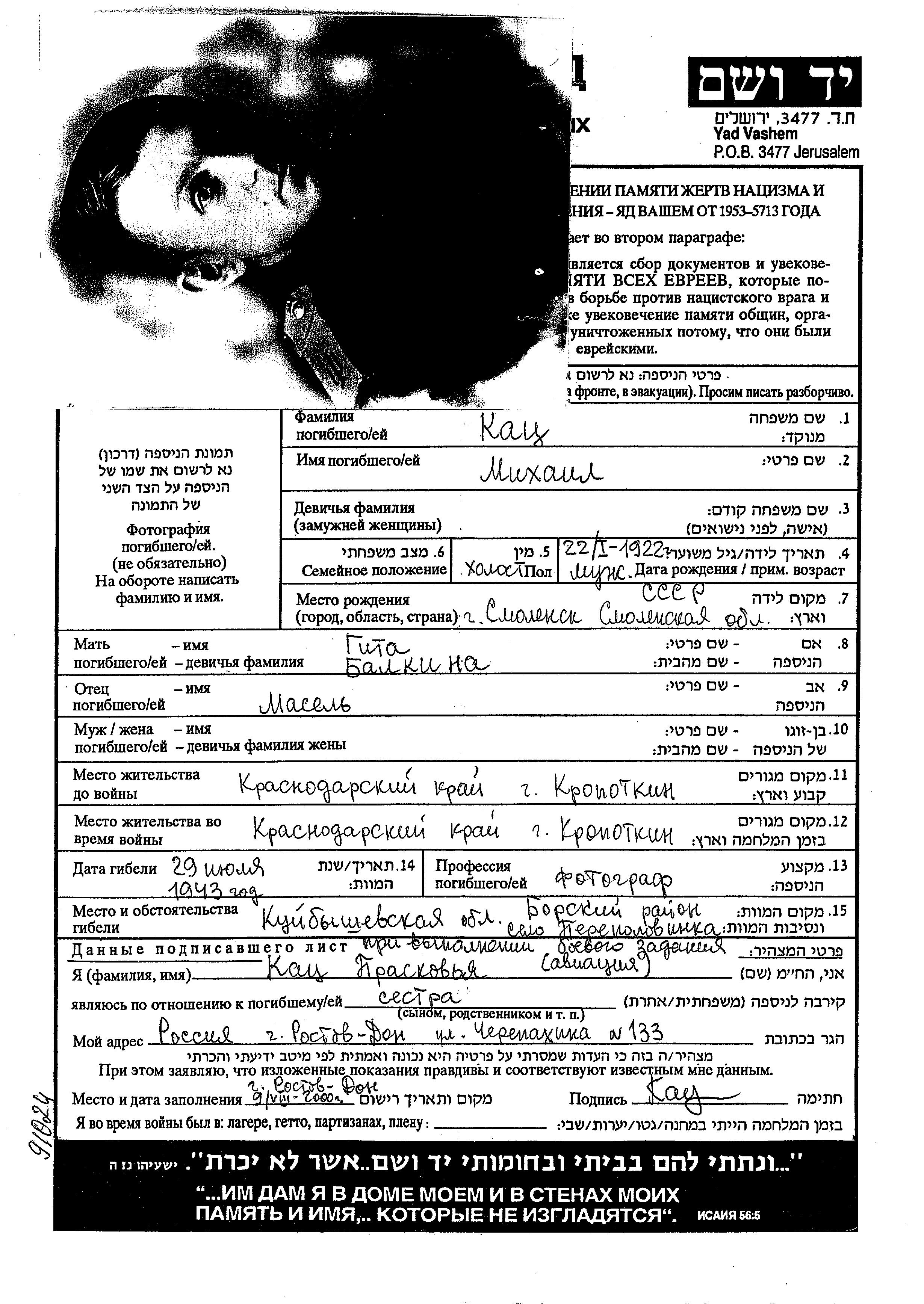 Katz Mikhail 1922 Kropotkin, Russia (USSR) Page of Testimony