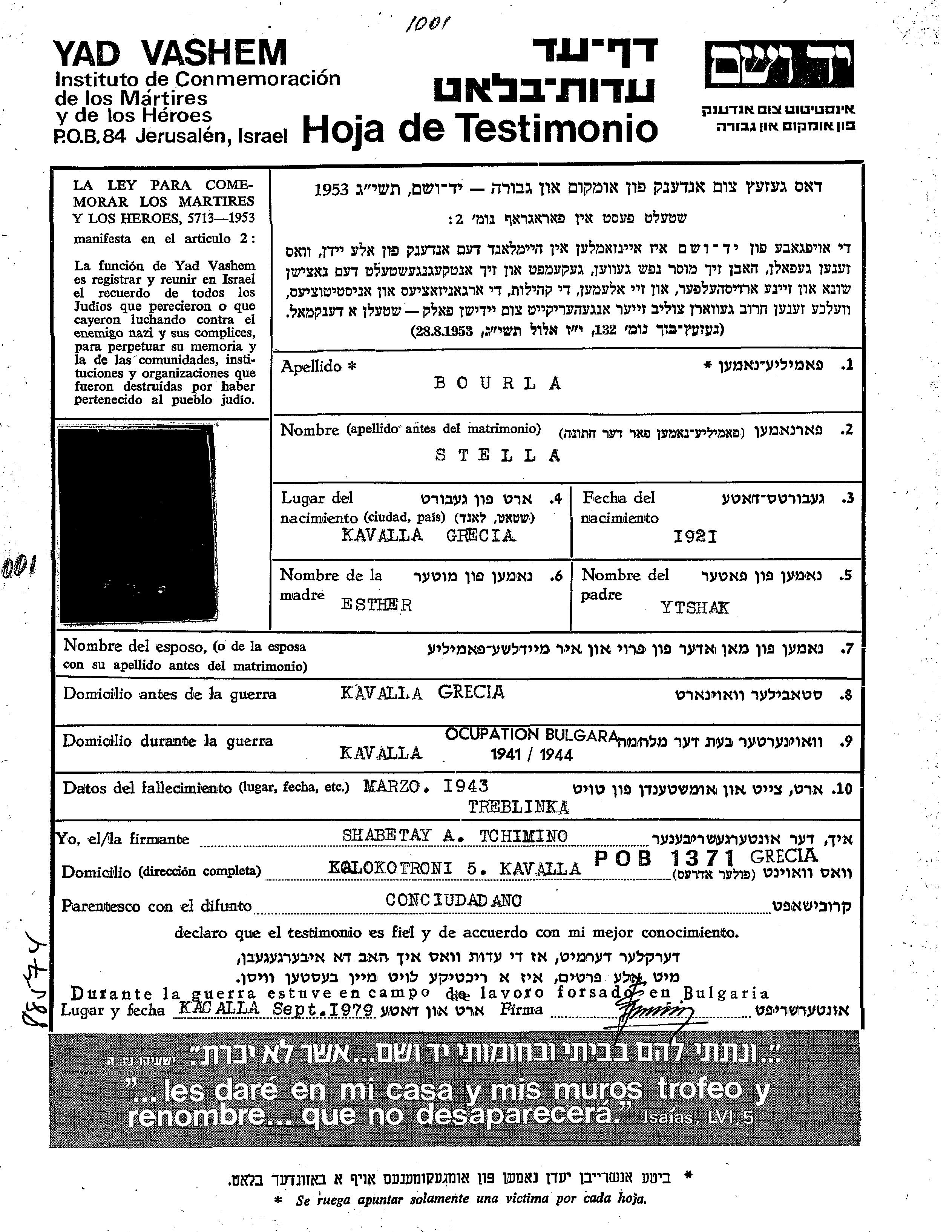 Bourla Stella 1921 Kavalla, Greece Page of Testimony