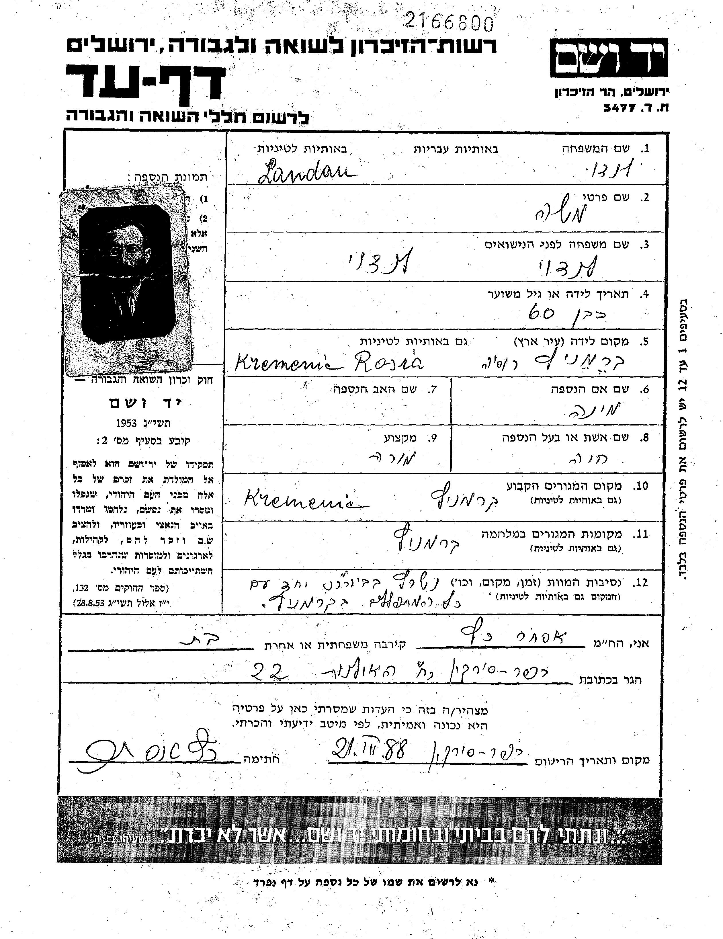 Landoi Moshe Krzemieniec, Poland Page of Testimony