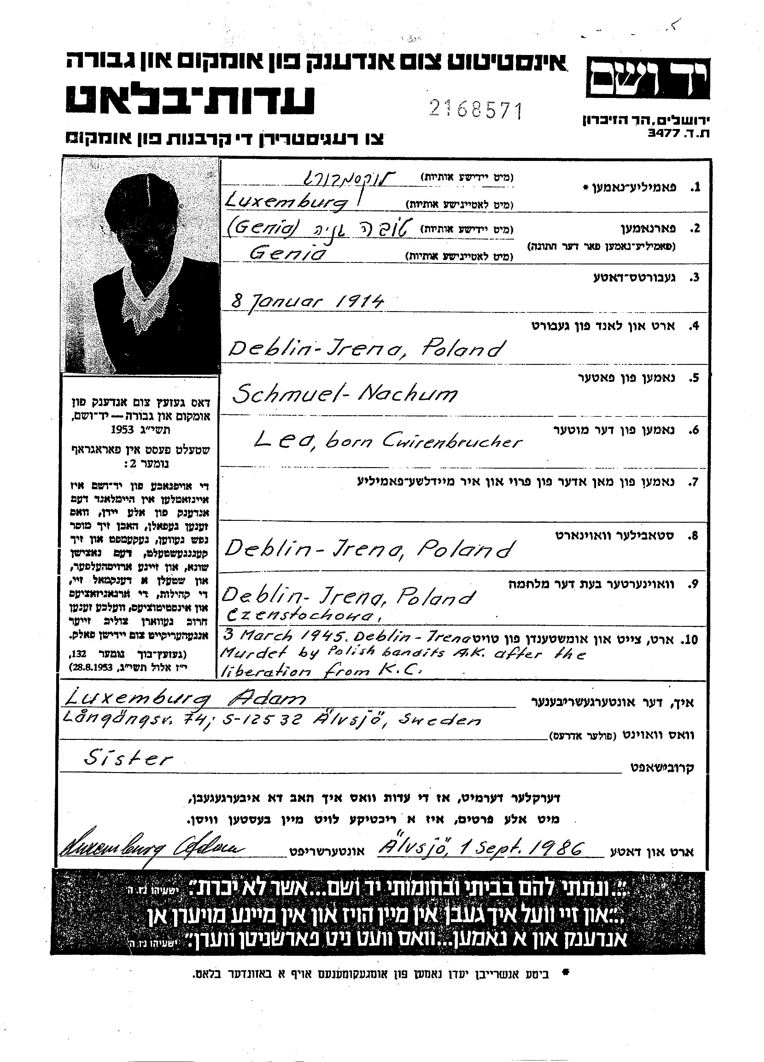 Luxemburg Genia Tova 1914 Deblin Irena, Poland Page of Testimony