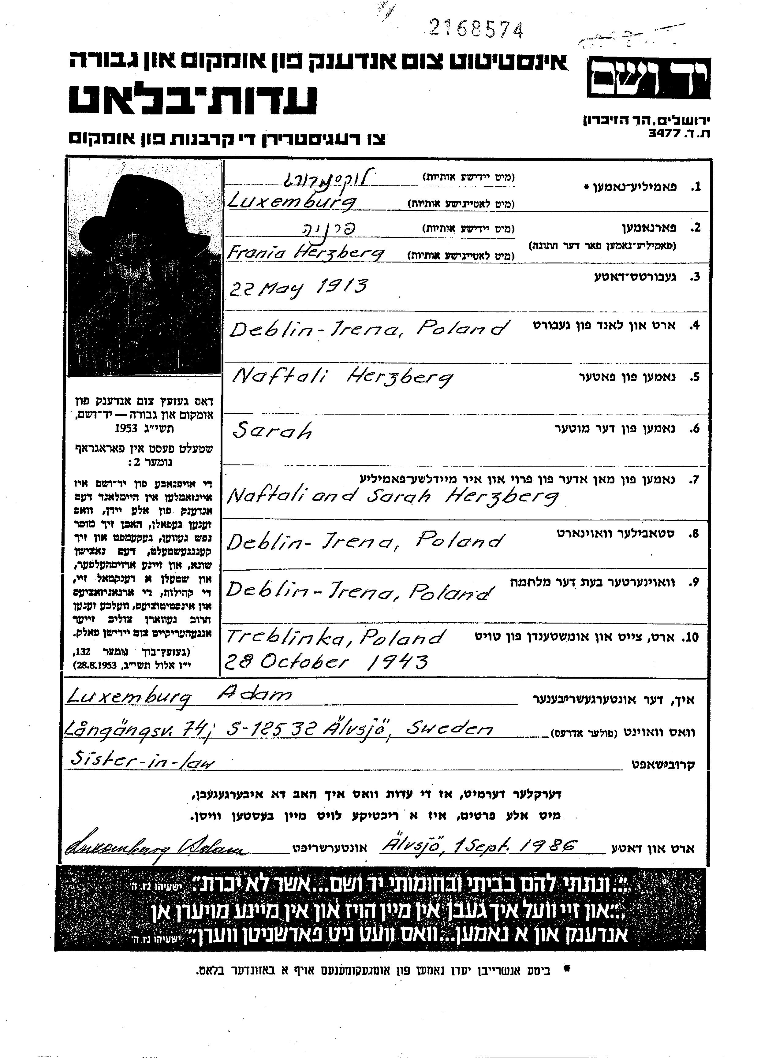 Luxemburg Frania 1913 Deblin Irena, Poland Page of Testimony