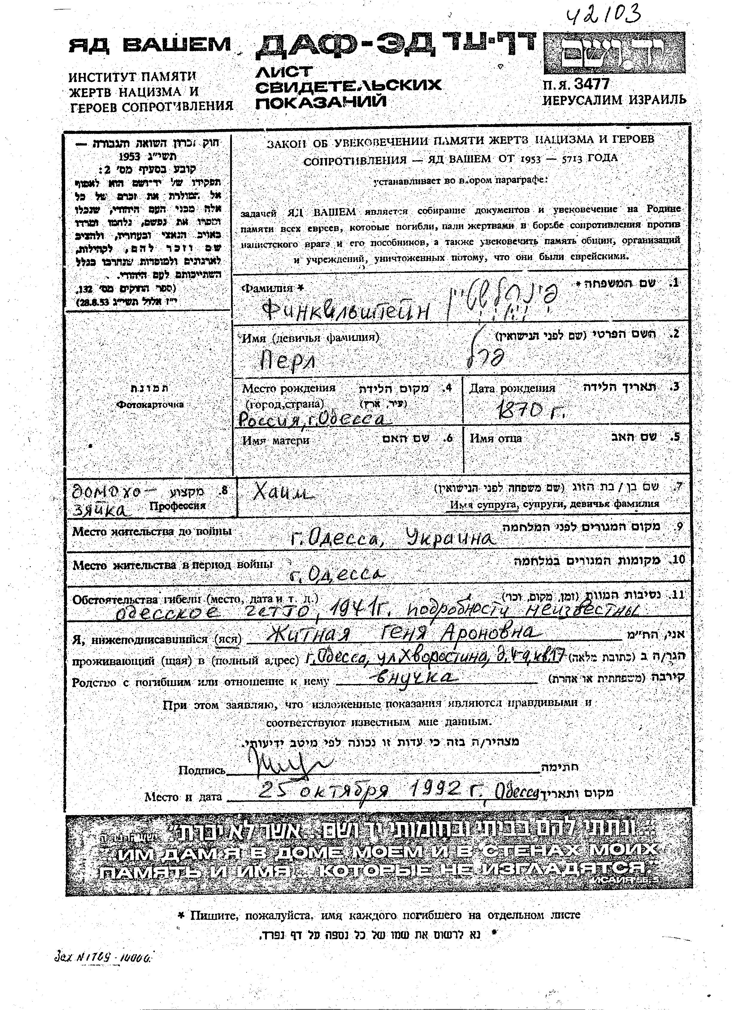 Finkelshtein Perl 1870 Odessa, Ukraine (USSR) Page of Testimony