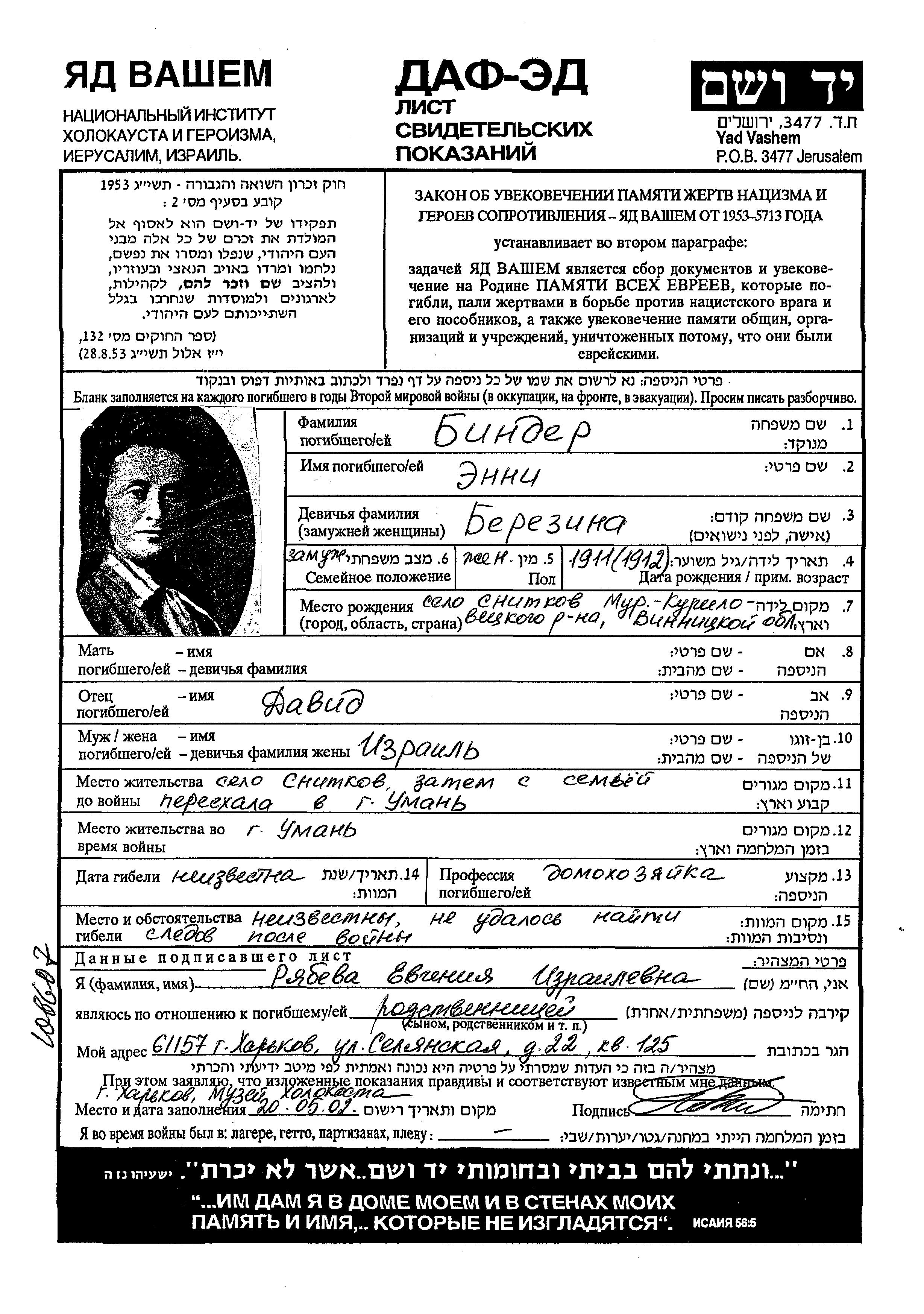 Enni Binder nee Berezina was born in Snitkov, Ukraine (USSR), 1911. She was a housewife. Prior to WWII she lived in Snitkov, Ukraine (USSR). Enni was murdered in the Shoah. Place of death: unstated place.