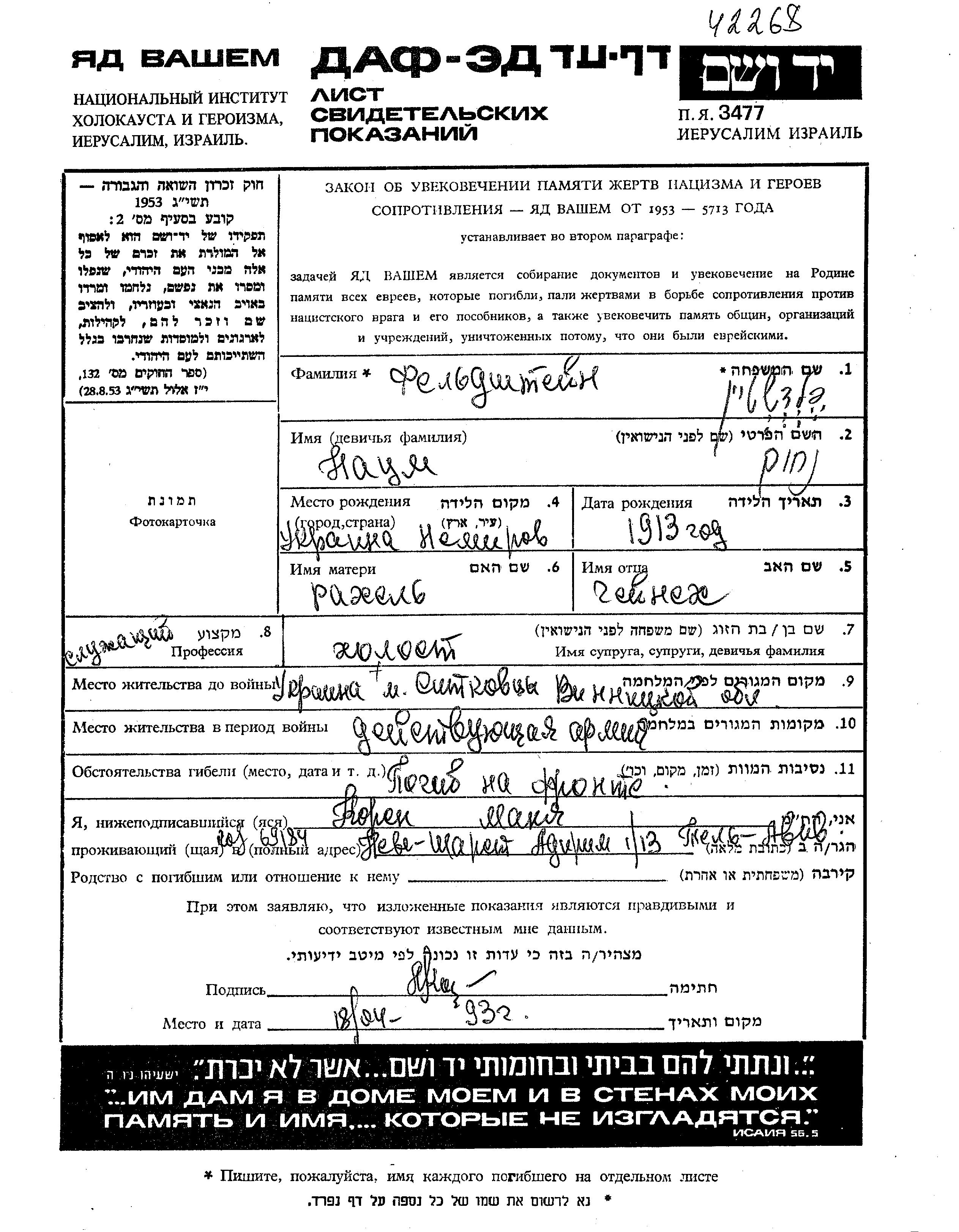 Naum Feldshtein was born in Nemirov, Ukraine (USSR), 1913 to Heinekh and Rakhel. He was a clerk and single. Prior to WWII he lived in Sitkovtsy, Ukraine (USSR). During the war he was in the Soviet armed forces. Naum was killed in military service in WWII.