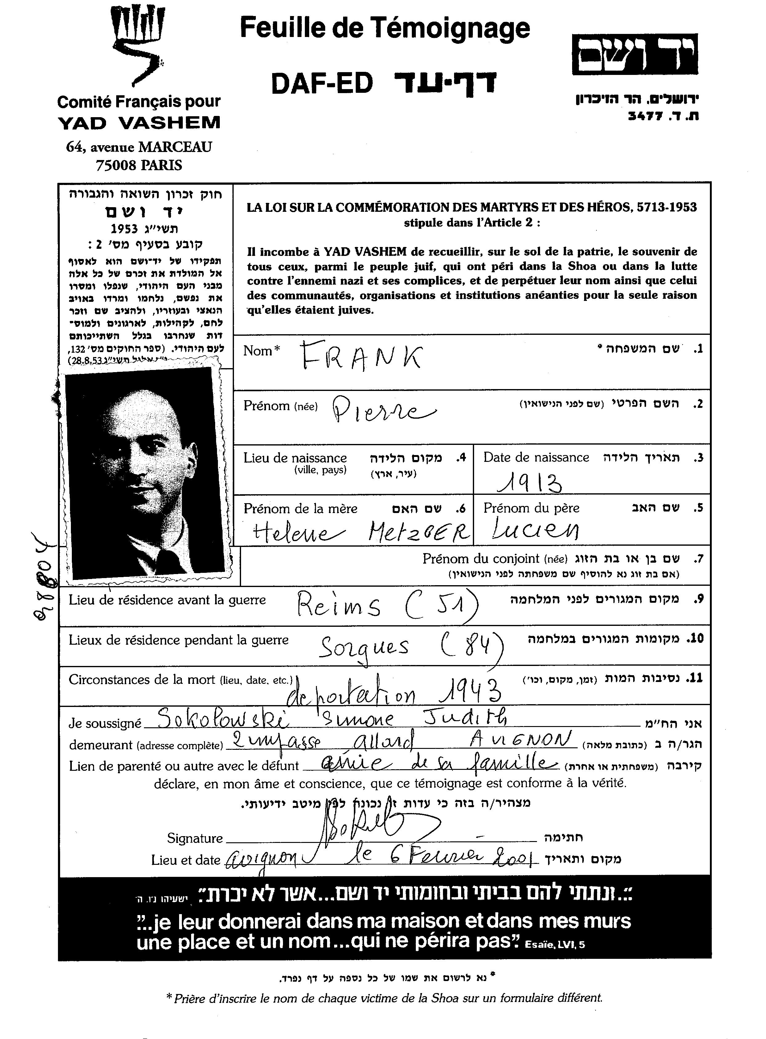 Pierre Frank was born, 1913. Prior to WWII he lived in Reims, France.