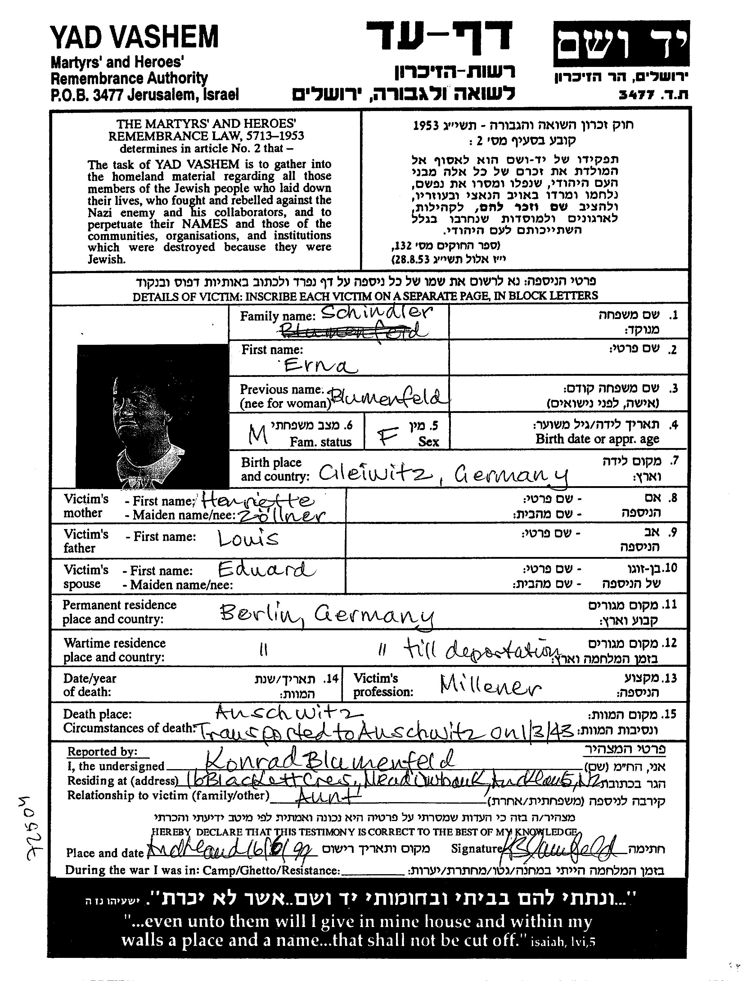 Erna Schindler nee Blumenfeld was born in Gleiwitz, Germany. Prior to WWII she lived in Berlin, Germany.