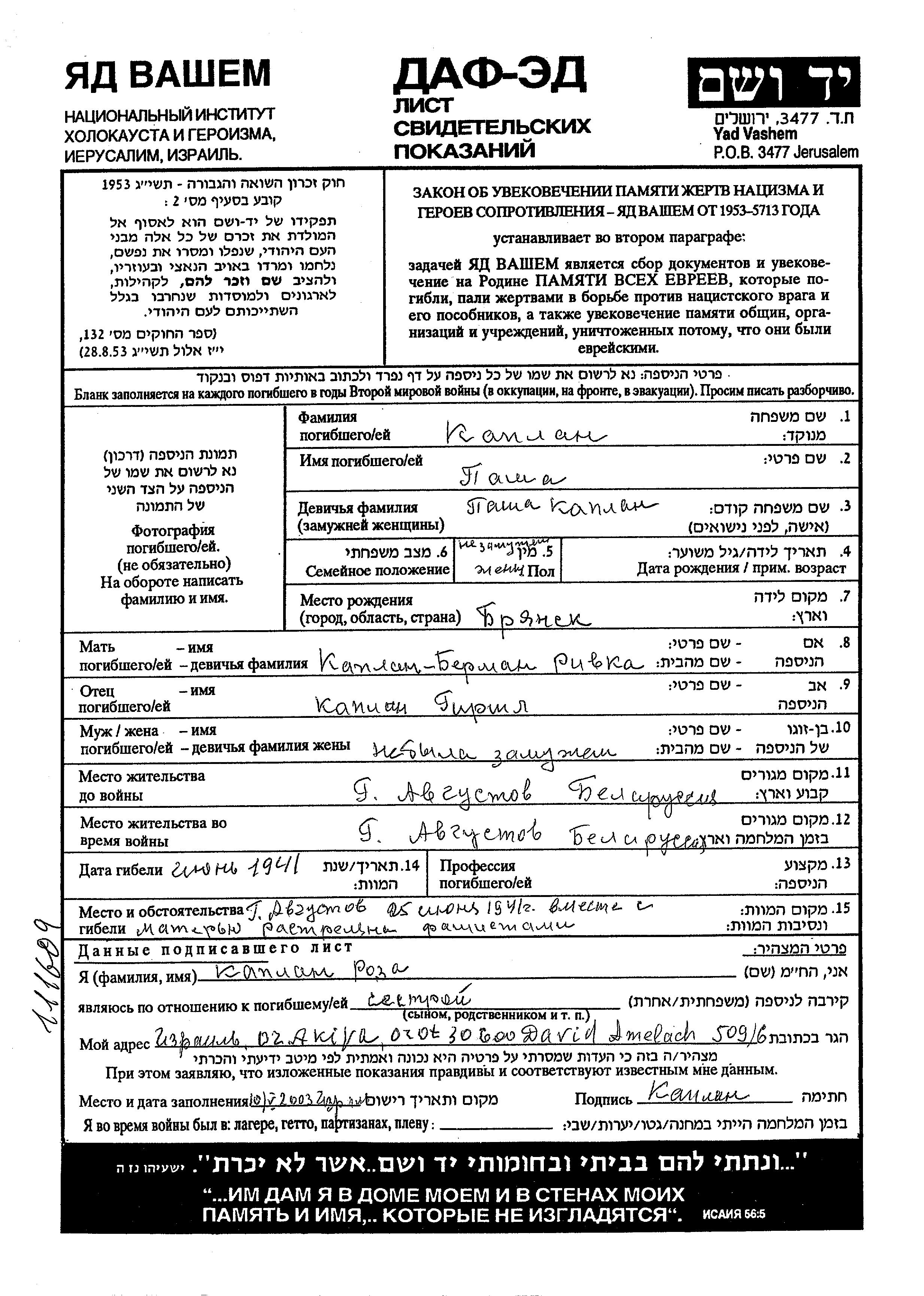 Kaplan Pasha Avgustov, Poland Page of Testimony