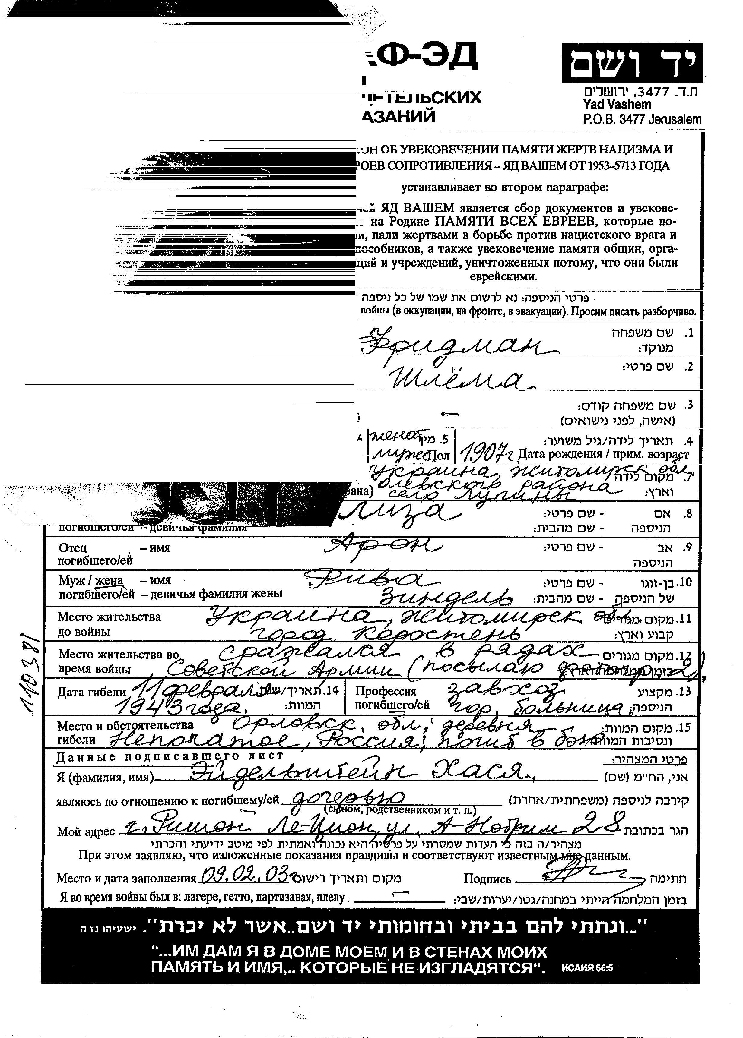 Fridman Shlyoma 1907 Korosten, Ukraine (USSR) Page of Testimony