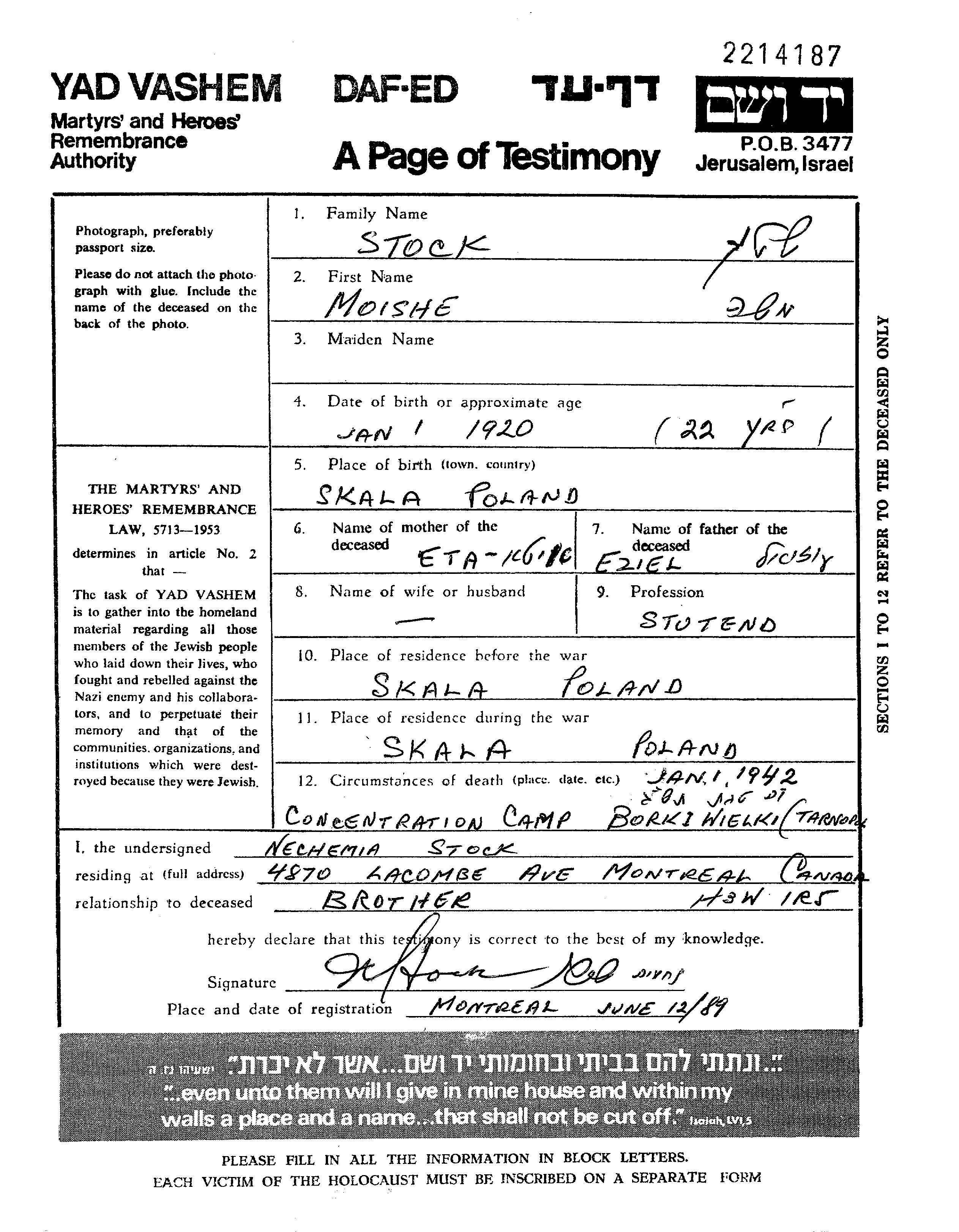 | Stock | Moishe | 1920 | Skala, Poland | Page of Testimony |