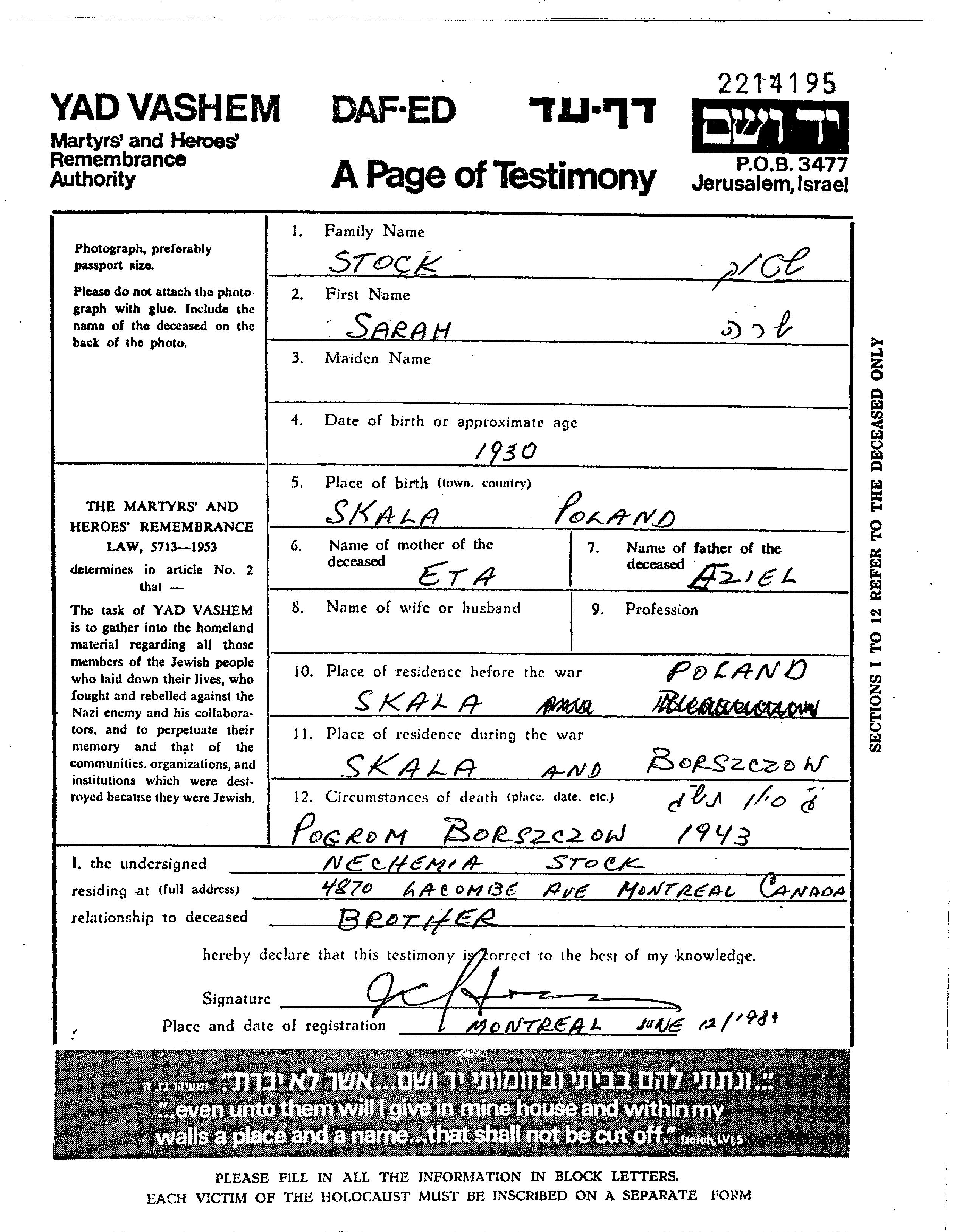 Yenta Sarah Stock was born in Skala Podolska, Poland, 1927. She was a student. Prior to WWII she lived in Skala Podolska, Poland.