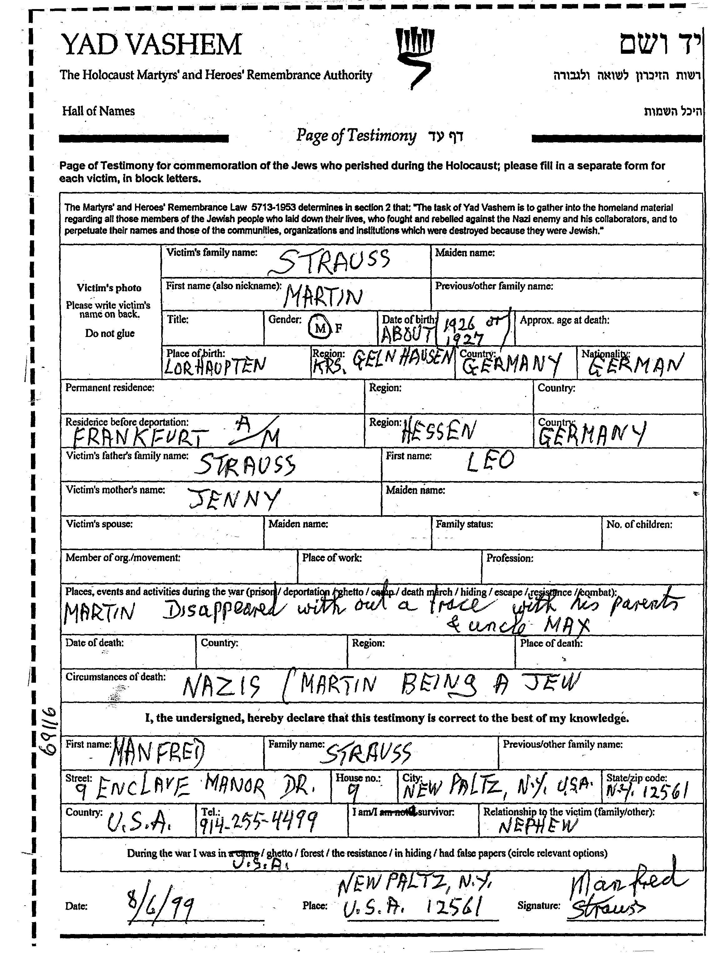 Strauss | Martin | 1927 | Frankfurt am Main, Germany | Page of Testimony |