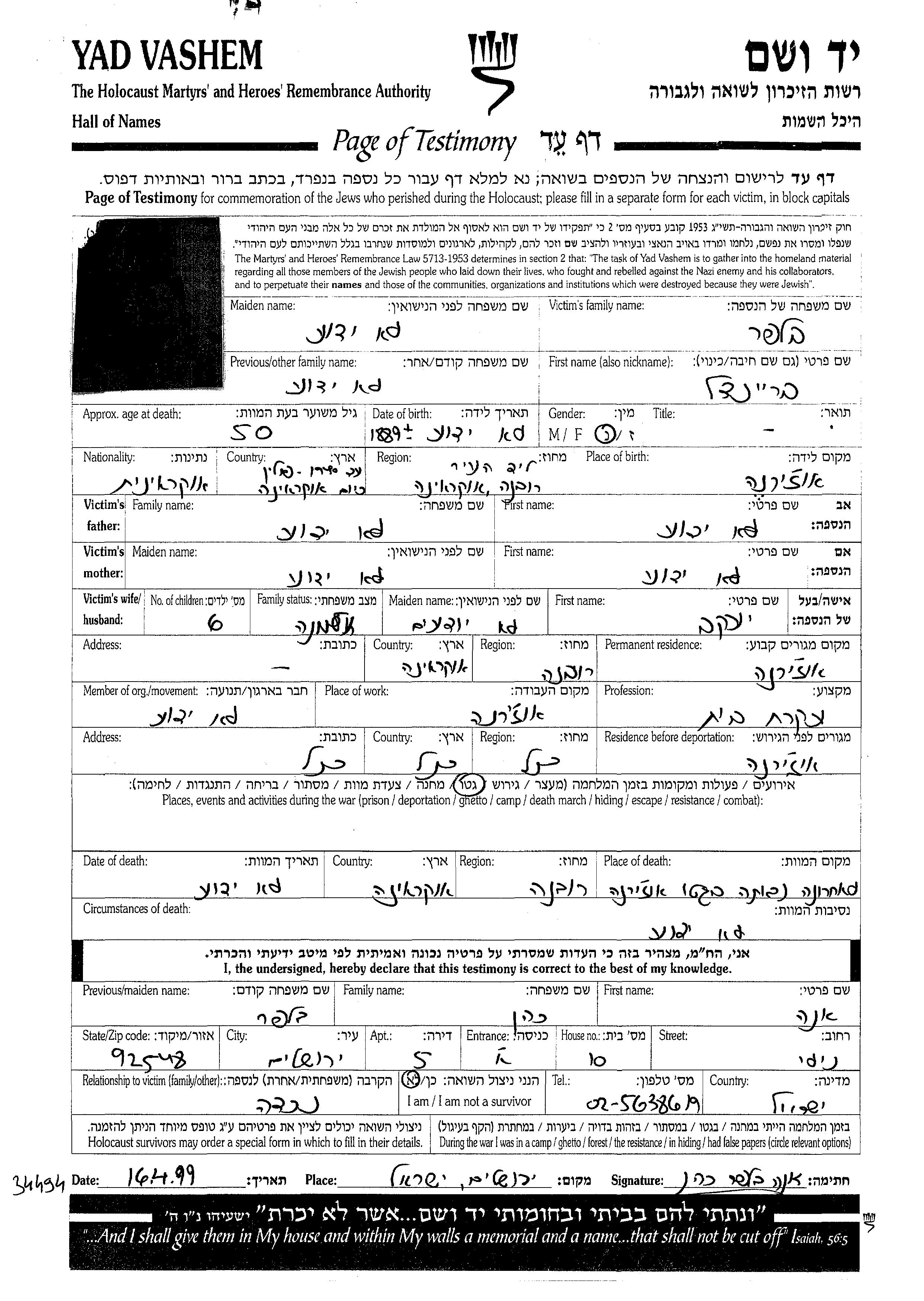Braindel Belfer was born in Jezierzany, Poland, 1889. She was a housewife. Prior to WWII she lived in Jezierzany, Poland. Braindel was murdered in the Shoah. Place of death: Jezierzany, Poland.