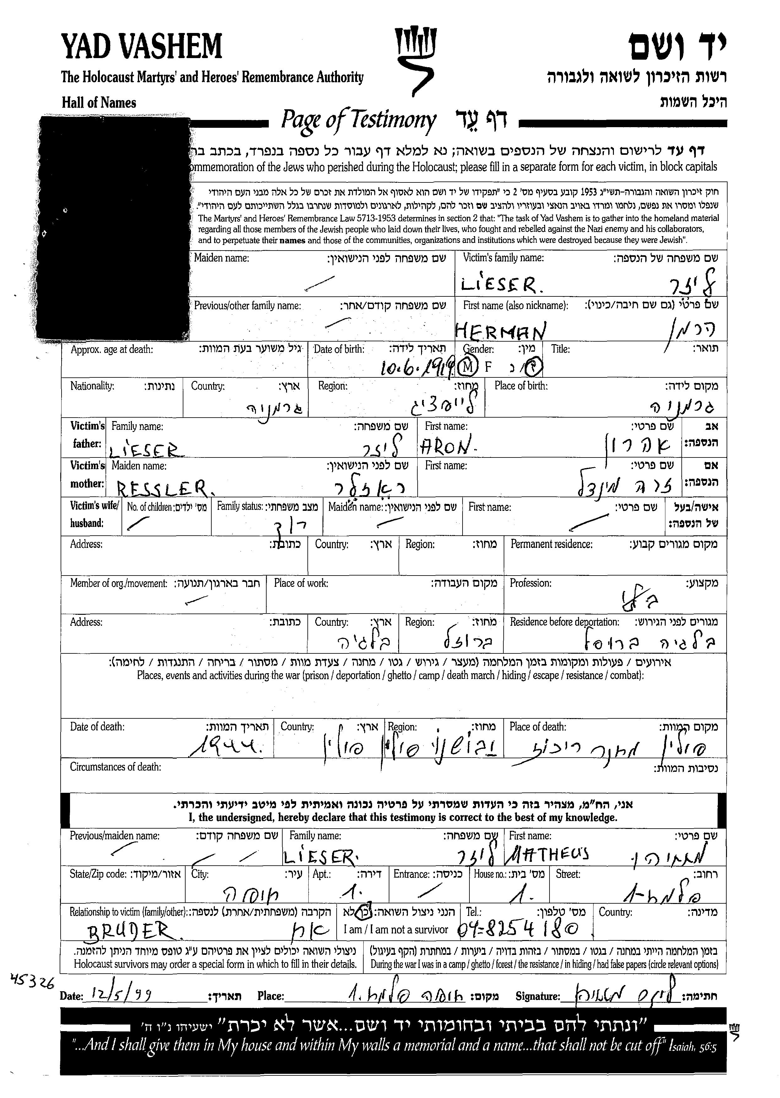 Yad Vashem - Pages of Testimony Names Memorial Collection