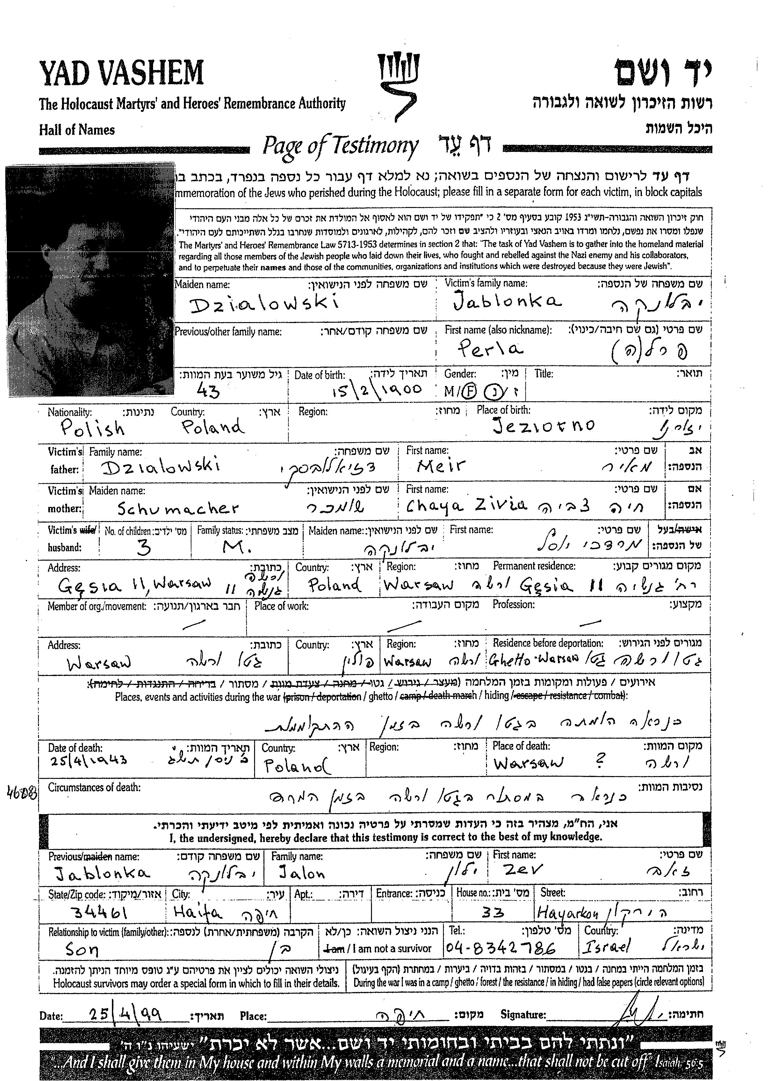 Perla Jablonka nee Dzialowski was born in Jeziorna Krolewska, Poland, 1900. Prior to WWII she lived in Warszawa, Poland. Perla was murdered in the Shoah. Place of death: Warsaw, Poland, 25/04/1943.