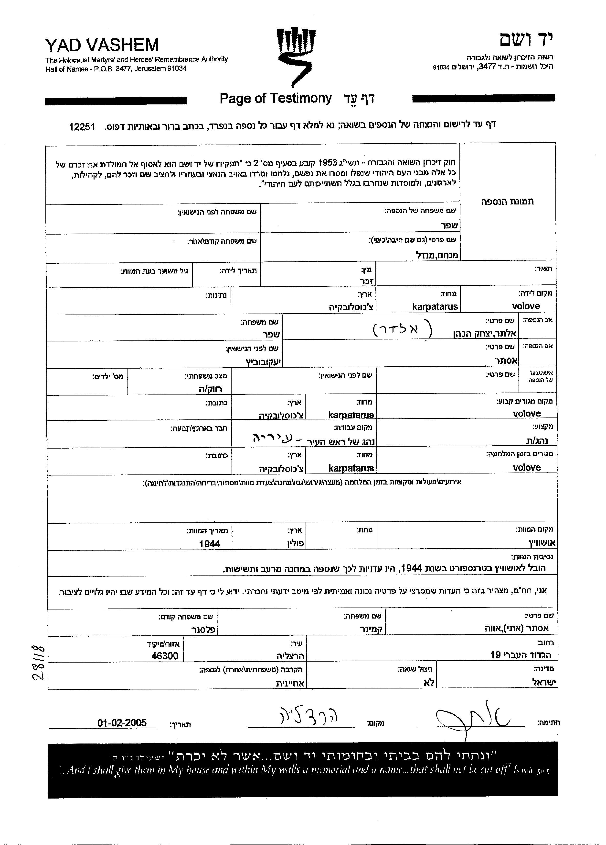 Shefer Mendel Menakhem Volove, Czechoslovakia Page of Testimony (digital signed)
