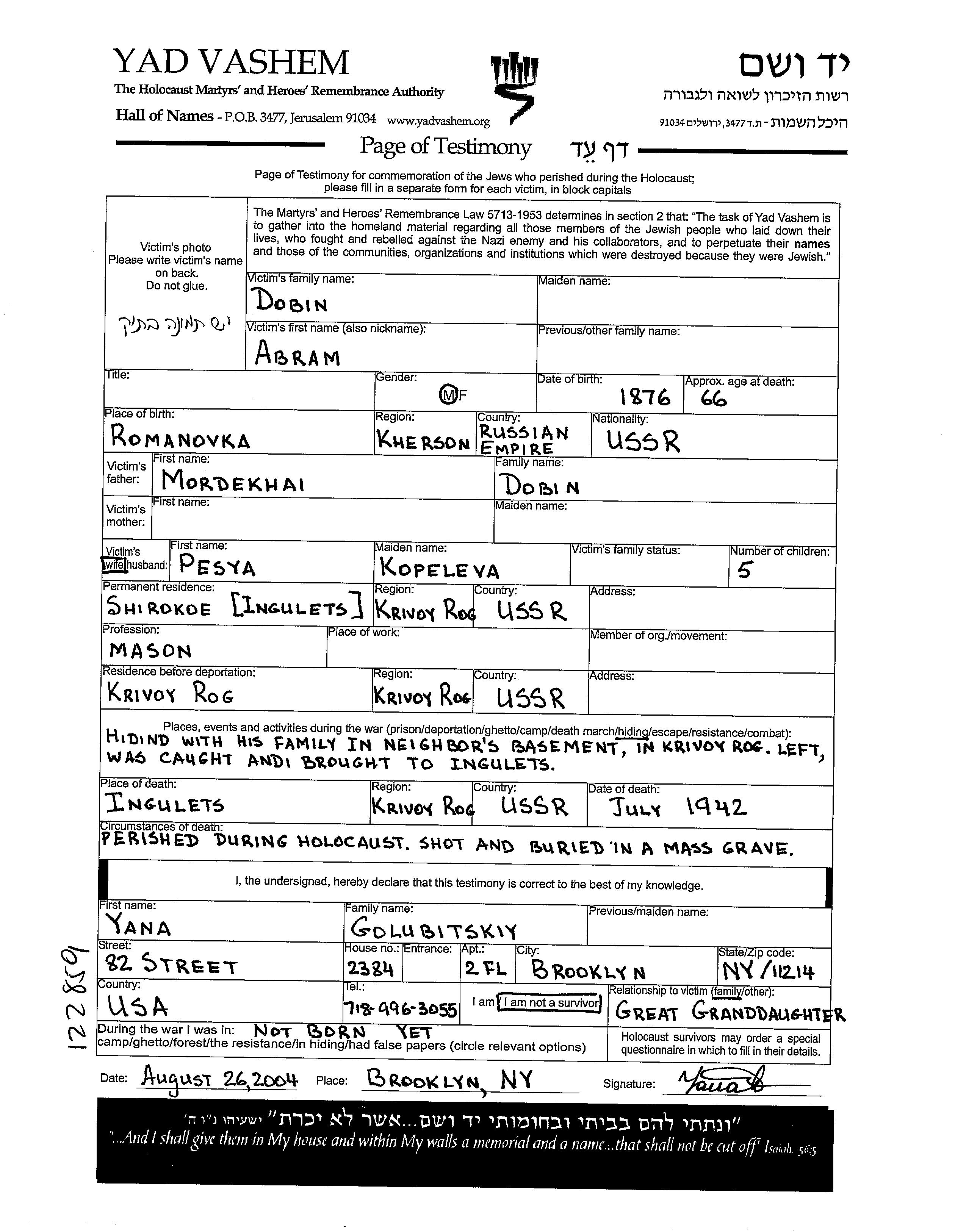 Abram Dobin was born in Romanovka, Ukraine (USSR), 1876. Prior to WWII he lived in Shirokoye, Ukraine (USSR). Abram was murdered in the Shoah. Place of death: Ingulets town, Ukraine (USSR), 07/1942.
