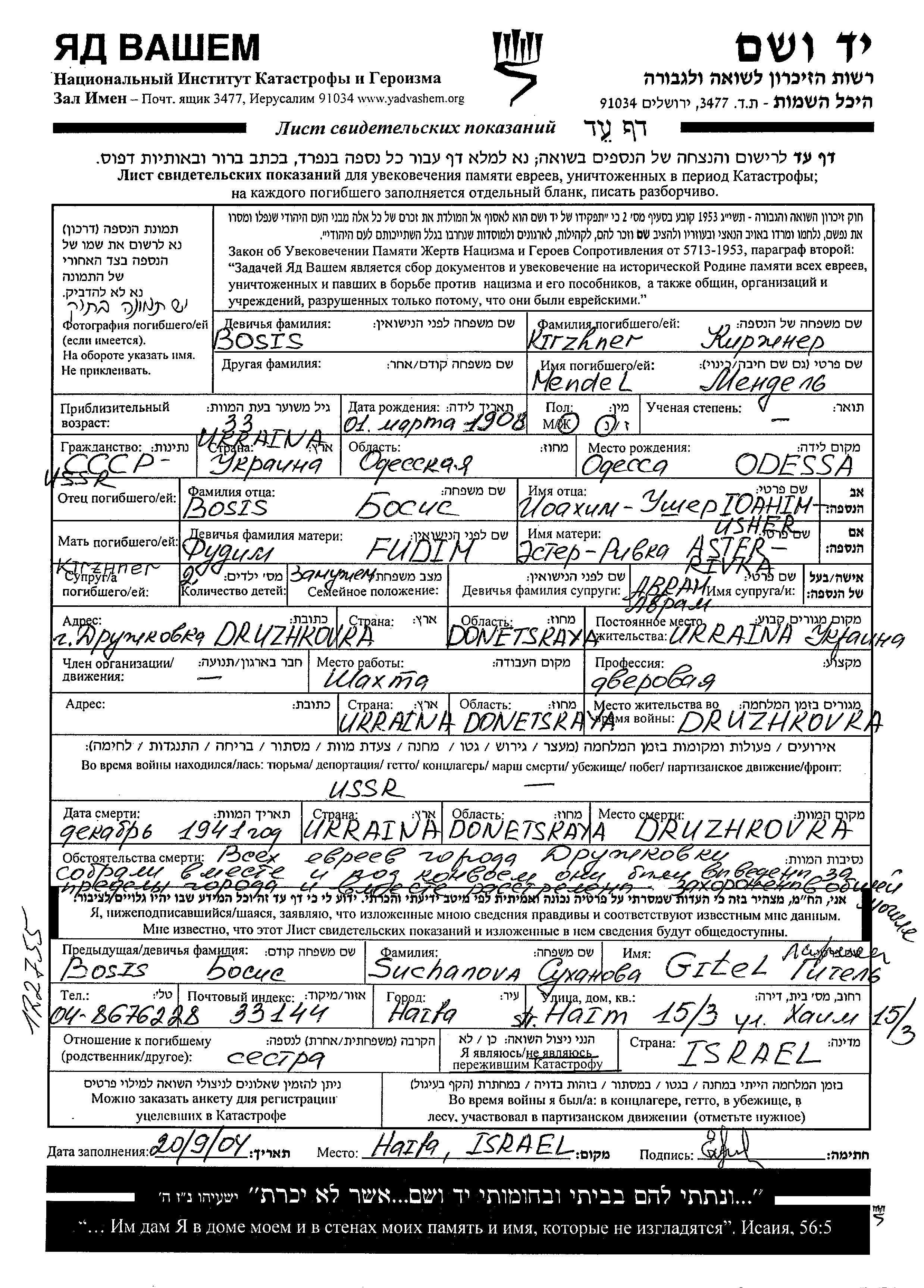 Mendel Kirzhner nee Bosis was born in Odessa, Ukraine (USSR), 1908. She was a worker. Prior to WWII she lived in Druzhkovka, Ukraine (USSR). Mendel was murdered in the Shoah. Place of death: Druzhkovka, Ukraine (USSR), 12/1941.