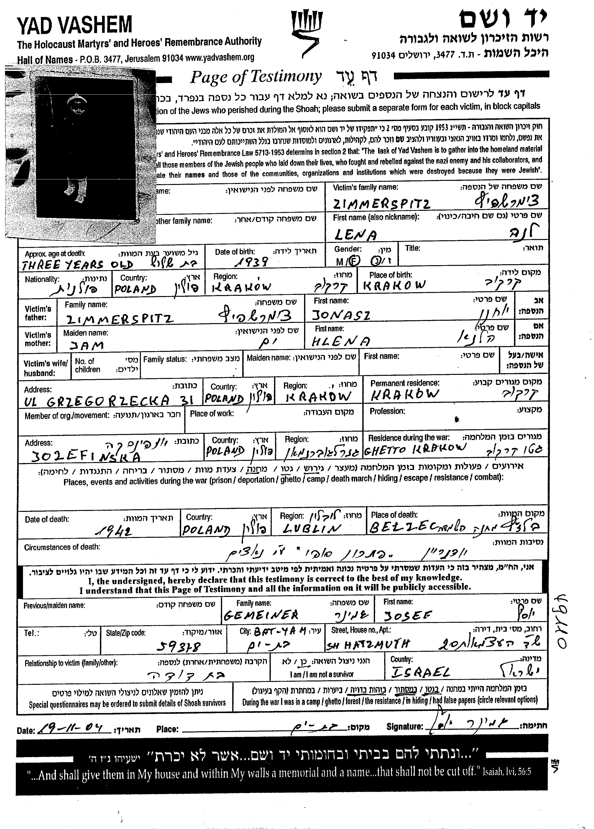 Tzimershpitz Lena 1939 Krakow, Poland Page of Testimony