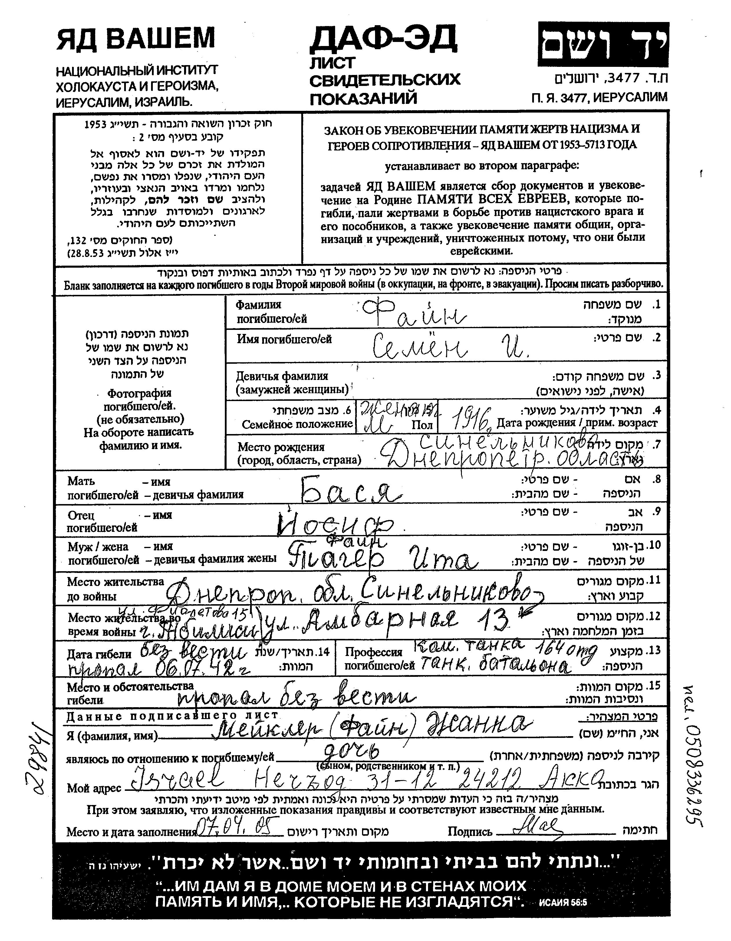 Semyon was murdered in the Shoah. Place of death: unstated place, 06/07/1942.