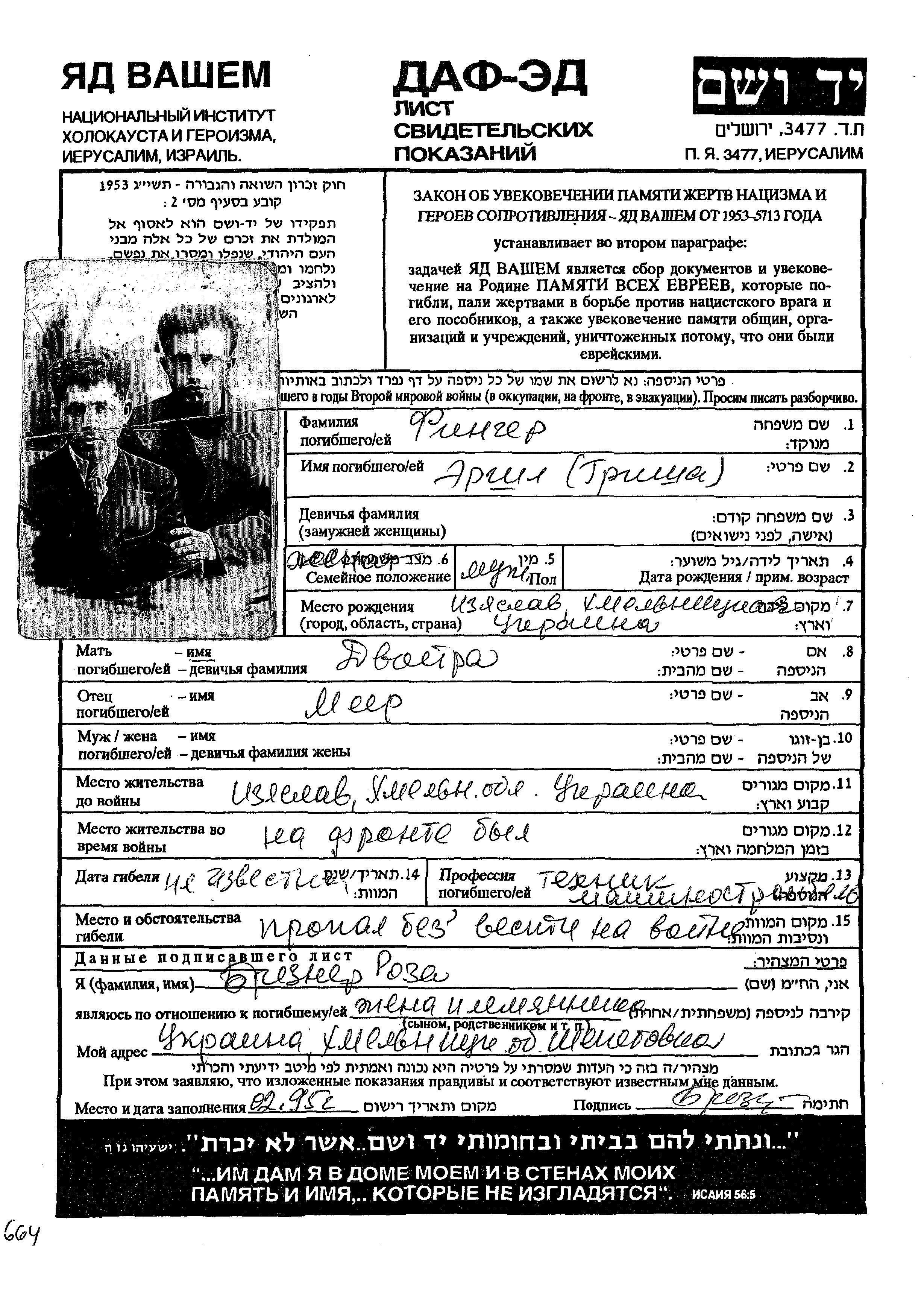 Grisha Ershl Finger was born in Izyaslav, Ukraine (USSR). He was a tekhnik mashinostroitel. Prior to WWII he lived in Izyaslav, Ukraine (USSR). Grisha Ershl was murdered in the Shoah. Place of death: unstated place.