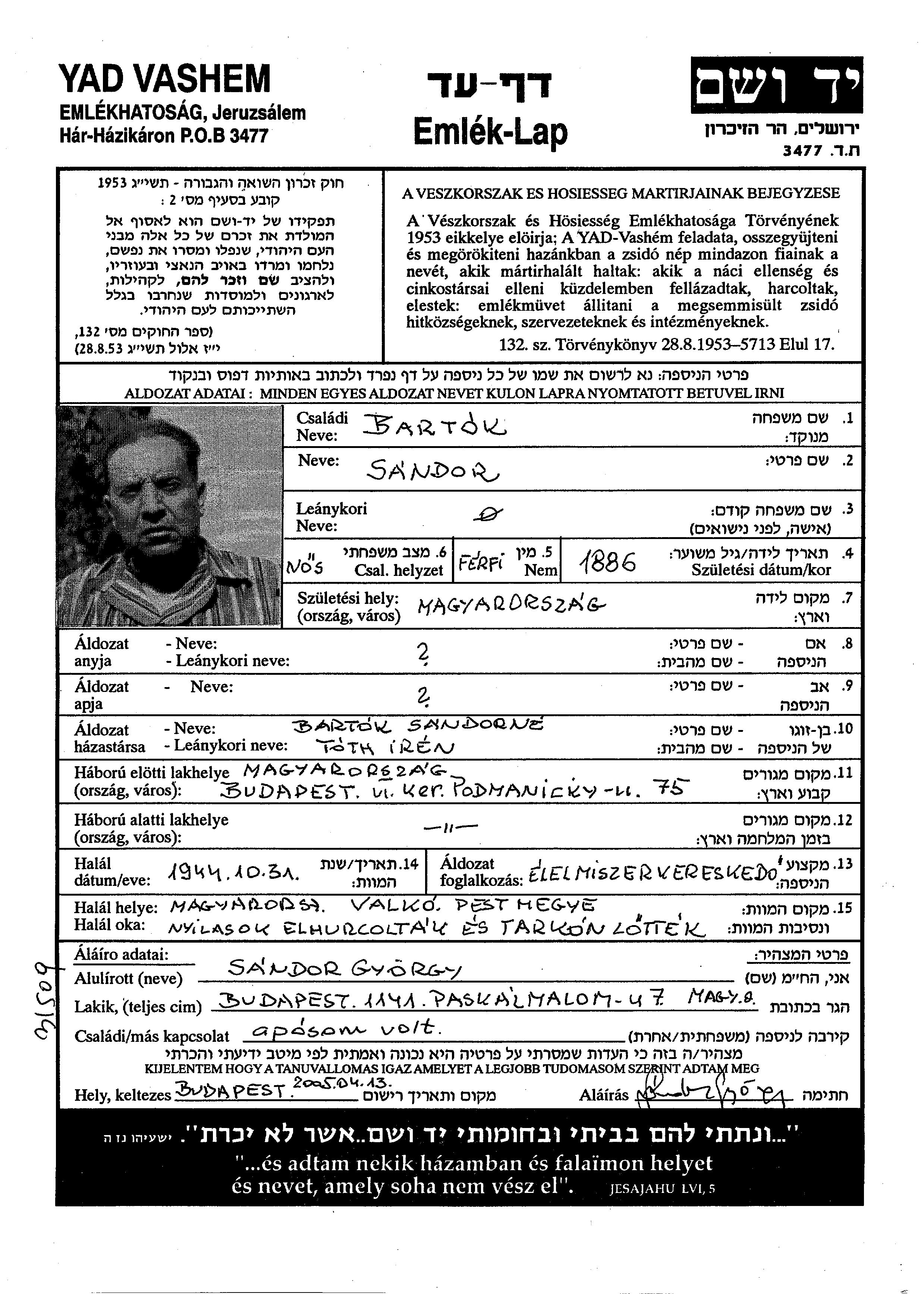 | Bartok | Sandor | 1886 | Budapest, Hungary | Page of Testimony |