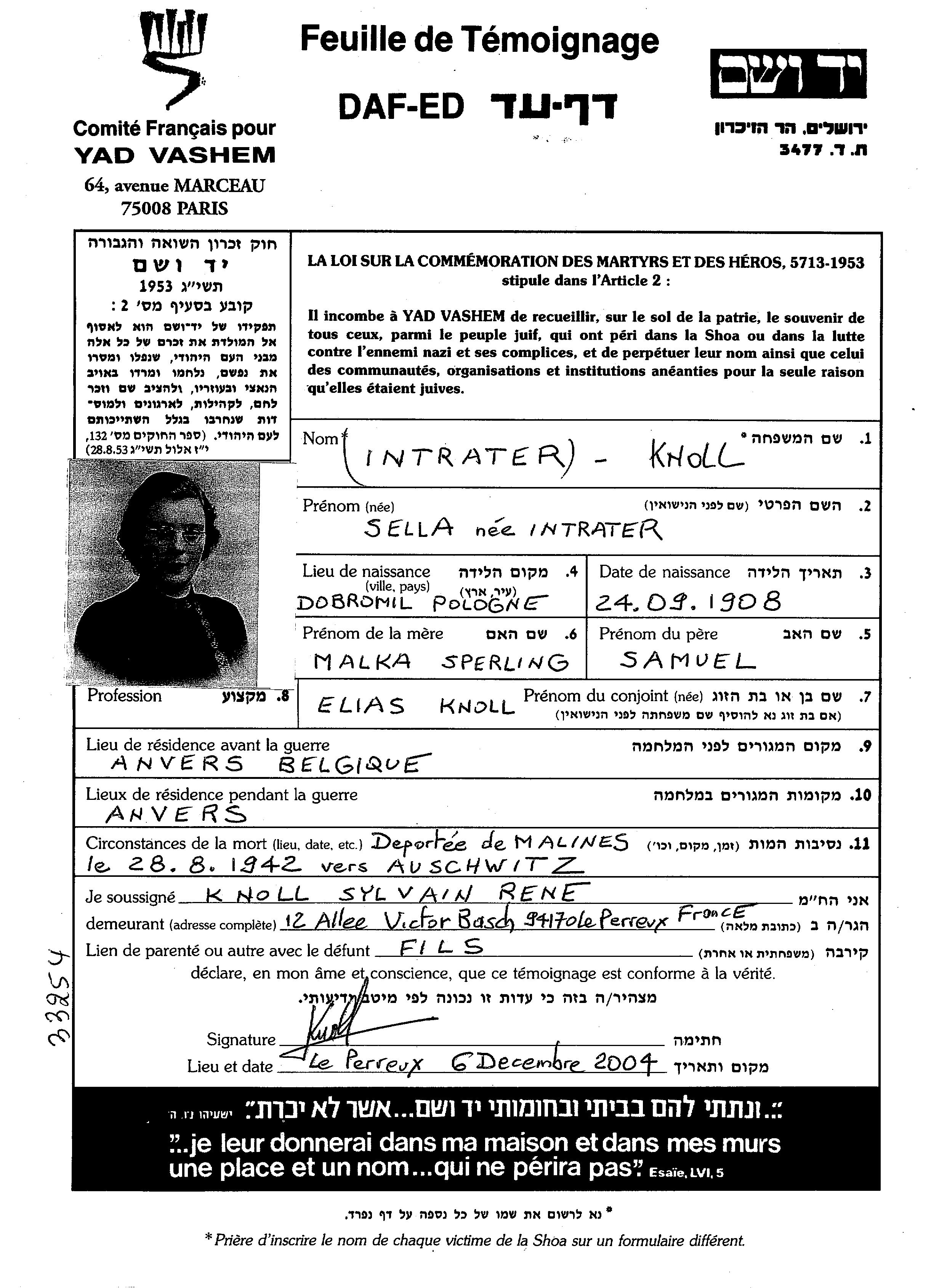 Knoll Sella 1908 Anvers, Belgium Page of Testimony
