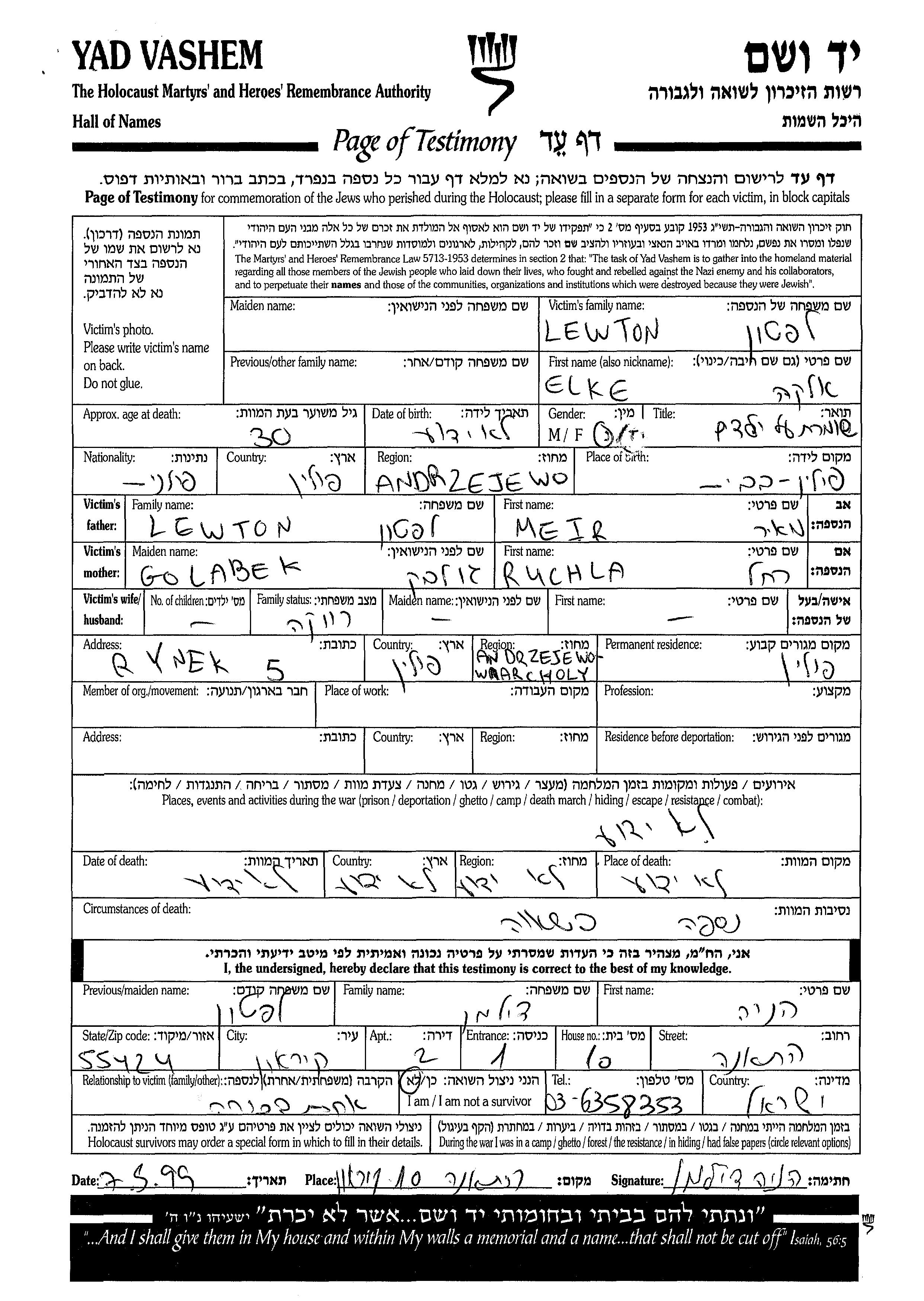 Lewton Lefton Elka Andrzejewo, Poland Page of Testimony