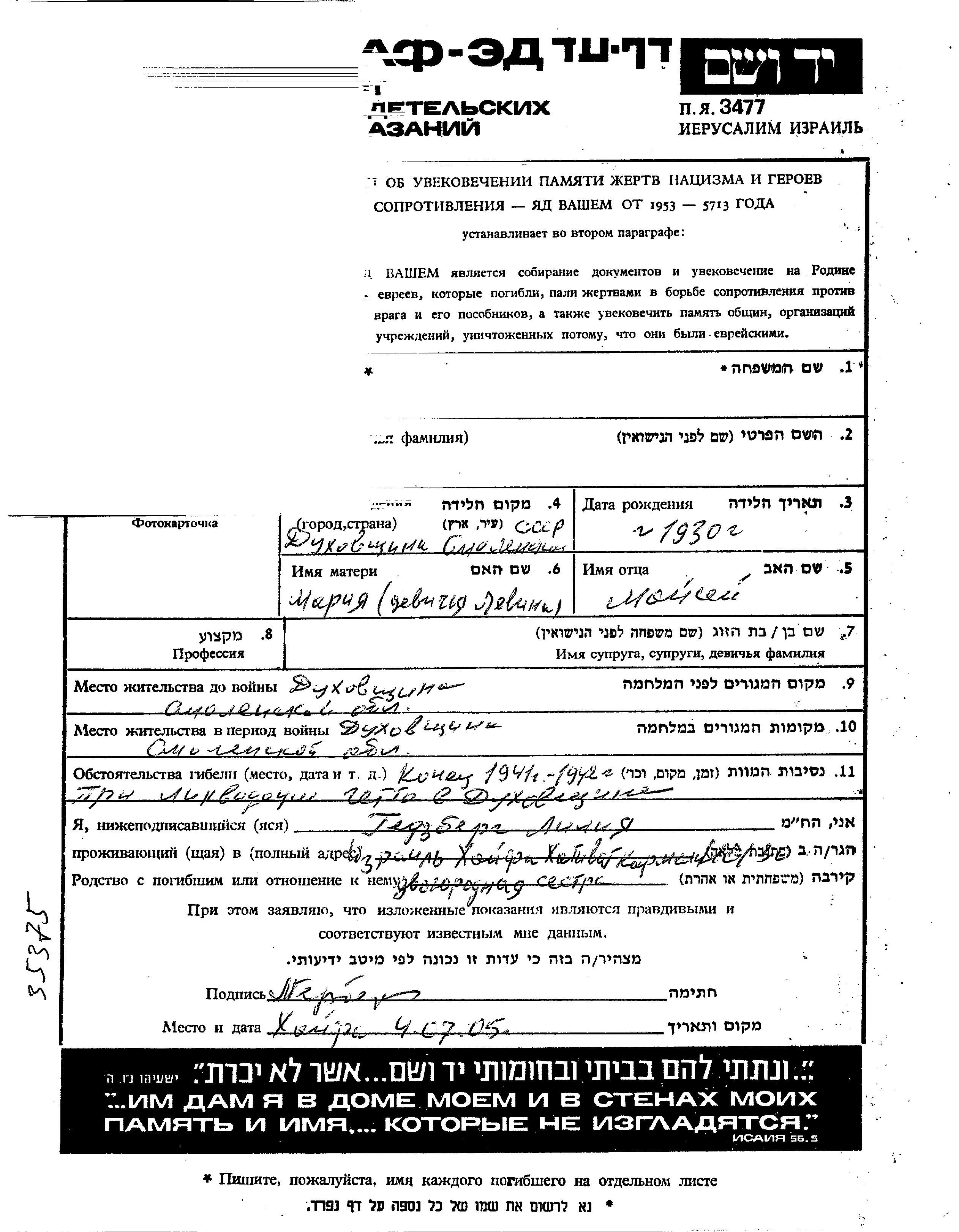 | Surname unknown | First name unknown | 1930 | Dukhovshchina, Russia (USSR) | Page of Testimony |