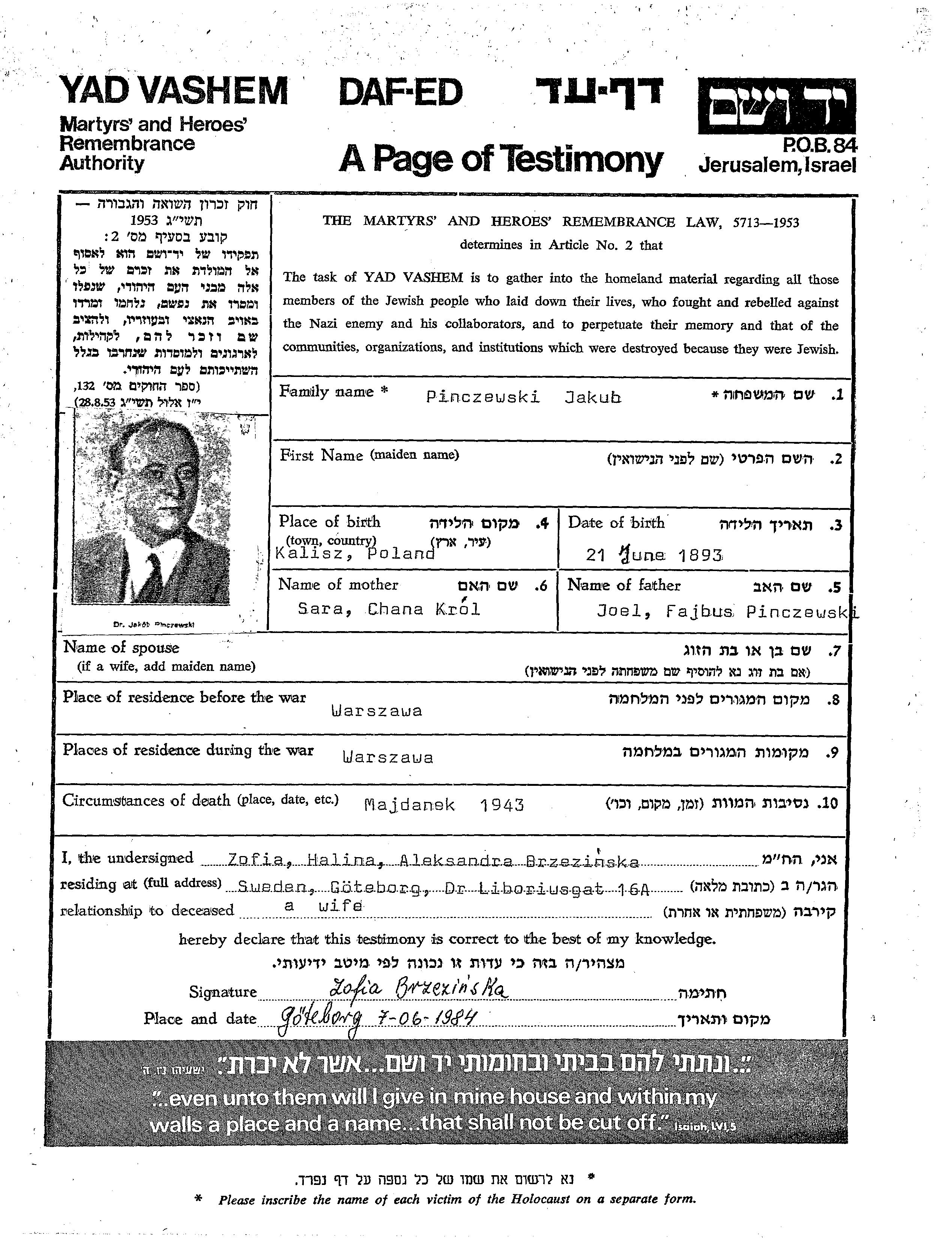 Pinczewski Jakub 1893 Warszawa, Poland Page of Testimony