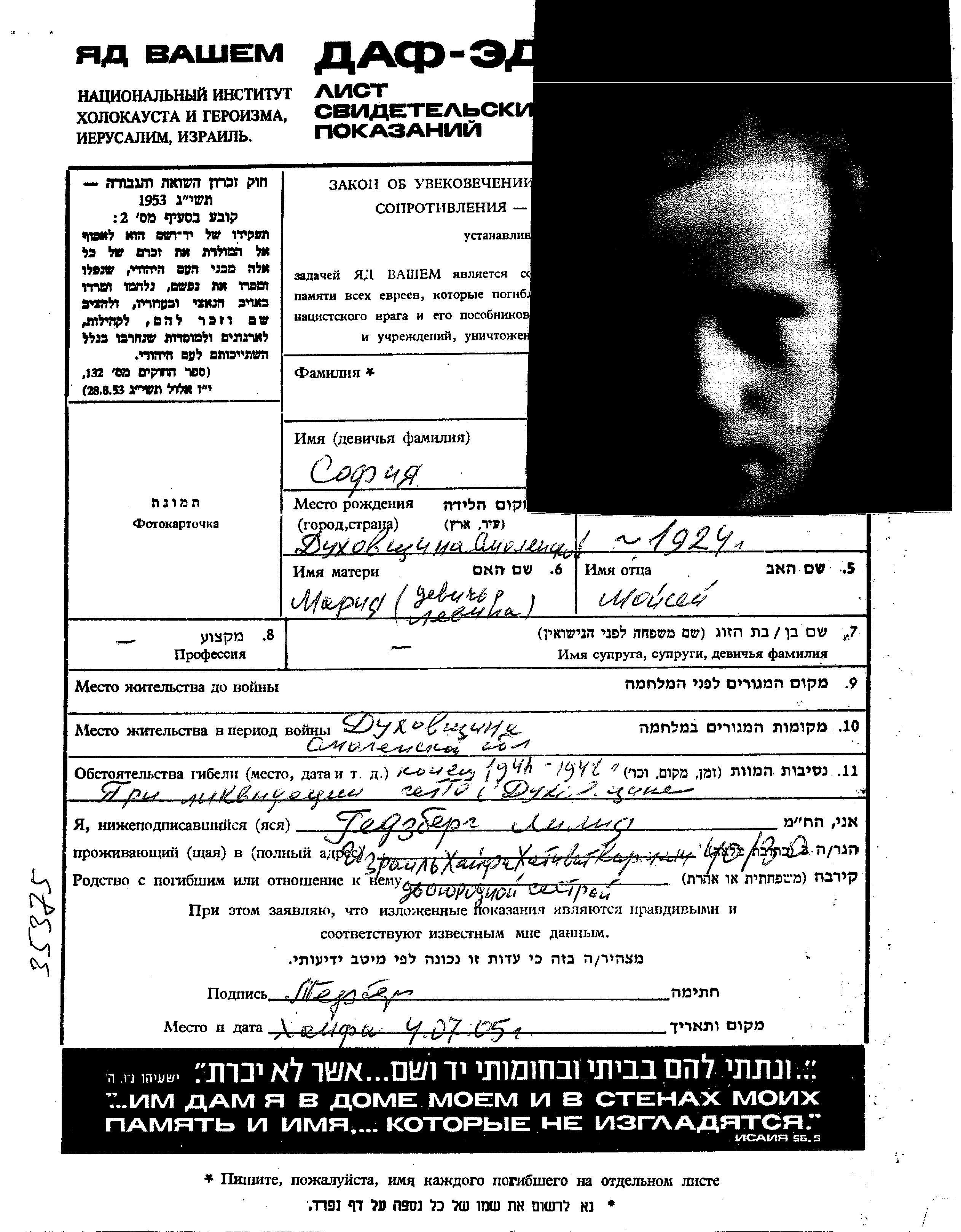 | Surname unknown | Sofiya | 1924 | Dukhovshchina, Russia (USSR) | Page of Testimony |