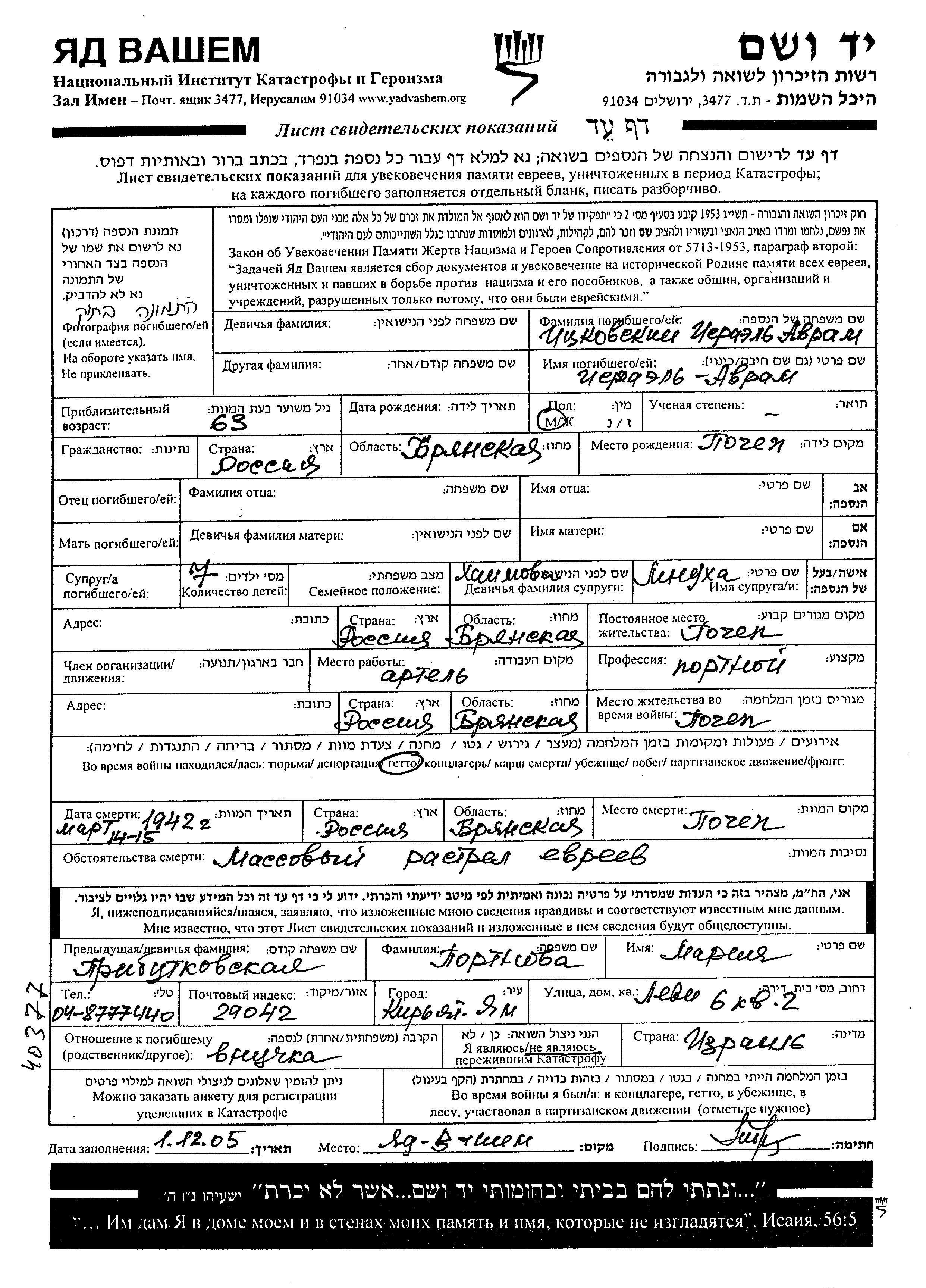 Israel Avram Itzkovski was born in Pochep, Russia (USSR), 1879. He was a tailor. Prior to WWII he lived in Pochep, Russia (USSR). Israel Avram was murdered in the Shoah. Place of death: Pochep, Russia (USSR), 14/03/1942.