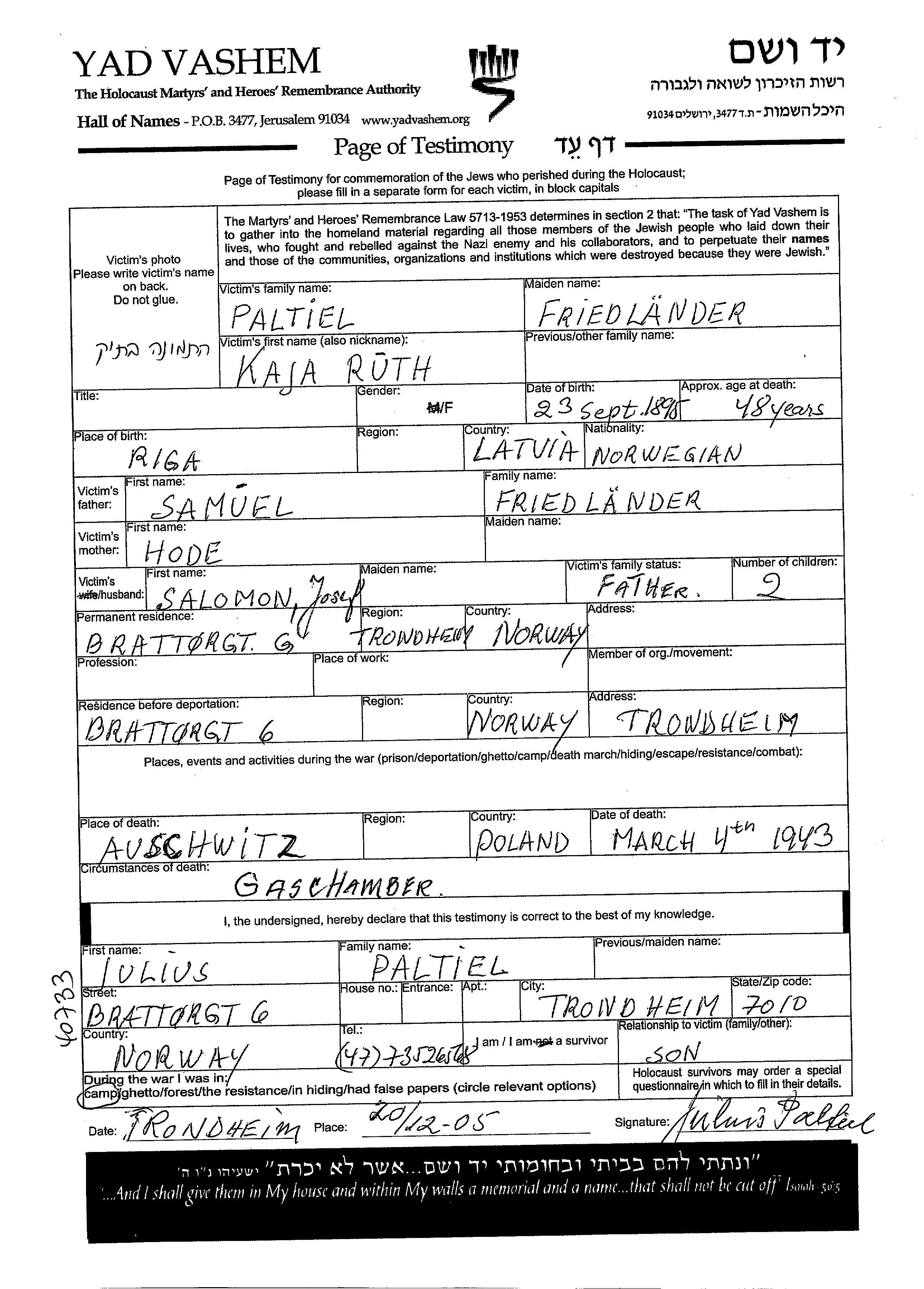 Kaja Ruth Paltiel nee Friedlaender was born in Riga, Latvia, 1895. Prior to WWII she lived in Trondheim, Norway.
