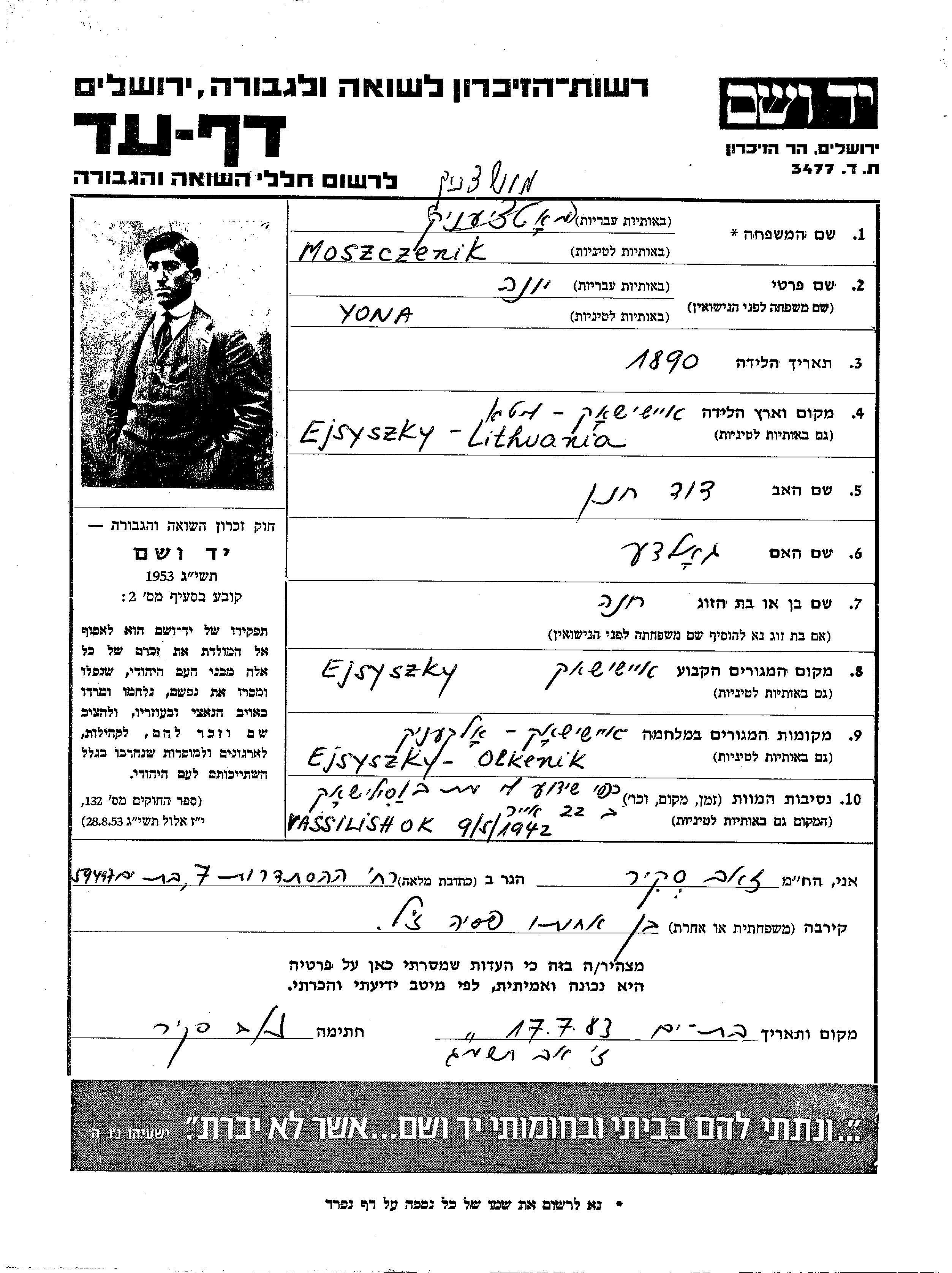 Moszczenik Yona 1890 Ejszyszki, Poland Page of Testimony