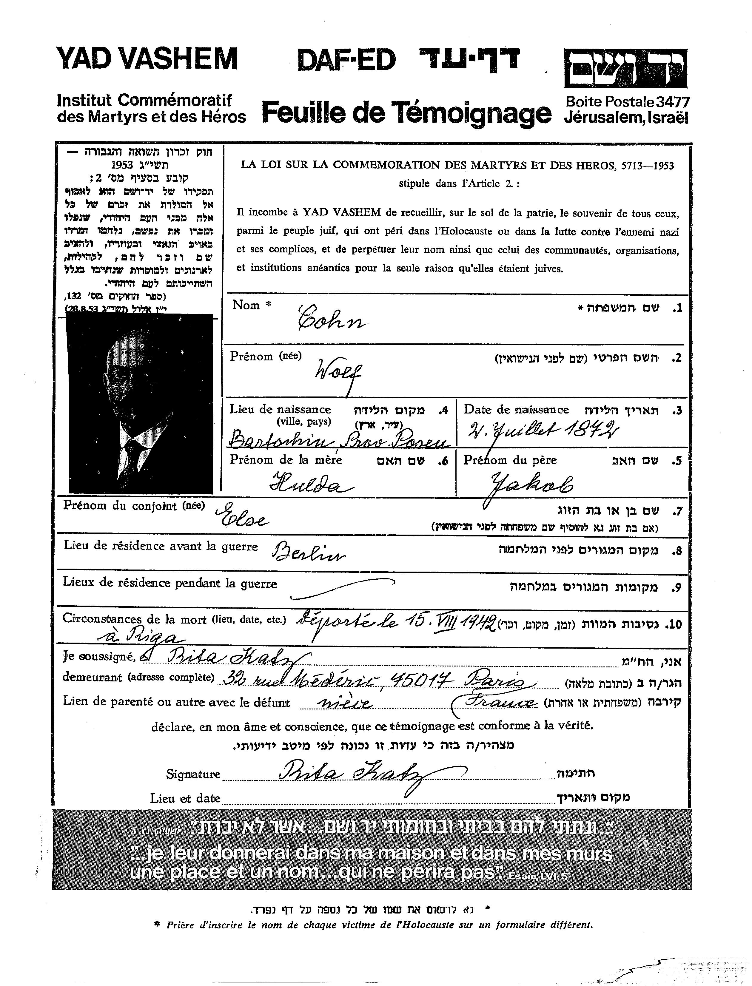 Cohn Wolf 1872 Berlin, Germany Page of Testimony