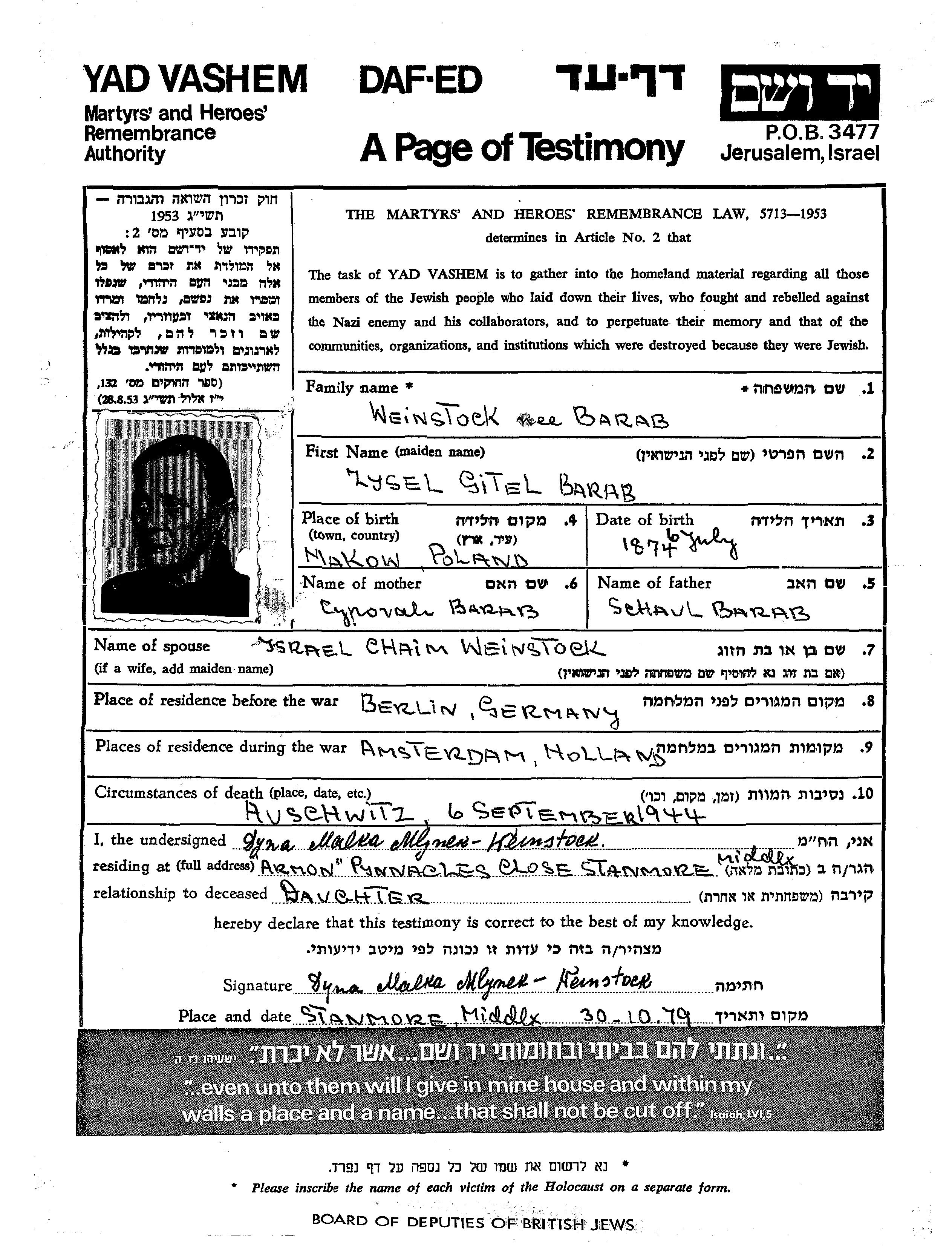 Zysel Gitel Weinstock nee Barab was born in Makow Mazowiecki, Poland, 1874. Prior to WWII she lived in Berlin, Germany. Zysel Gitel was murdered in the Shoah. Place of death: Auschwitz, Poland, 06/09/1944.