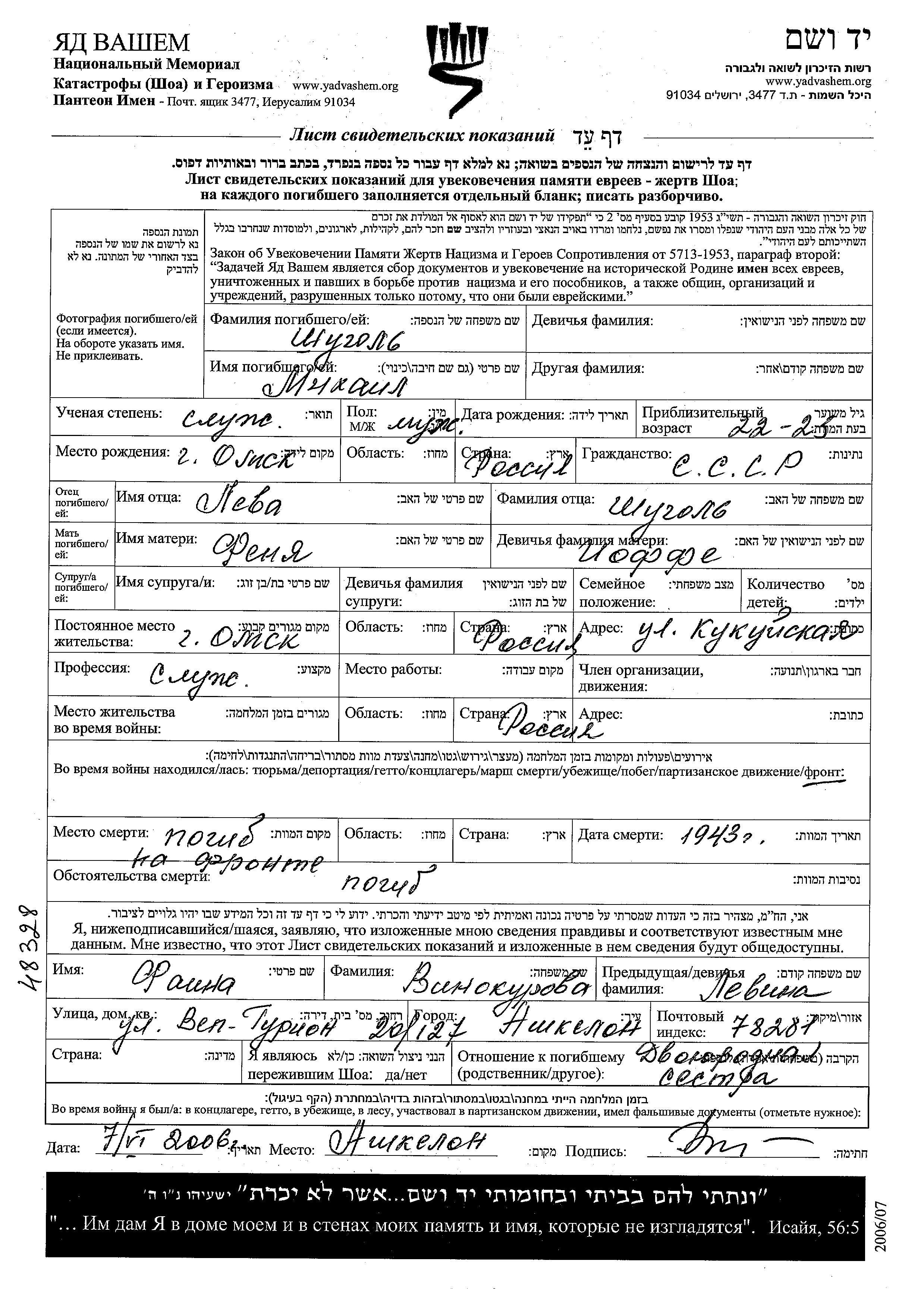 Mikhail Shugol was born in Omsk, Russia (USSR), 1921. He was an employee. Prior to WWII he lived in Omsk, Russia (USSR). Mikhail was killed in military service in WWII. Place of death: the Soviet armed forces, 1943.