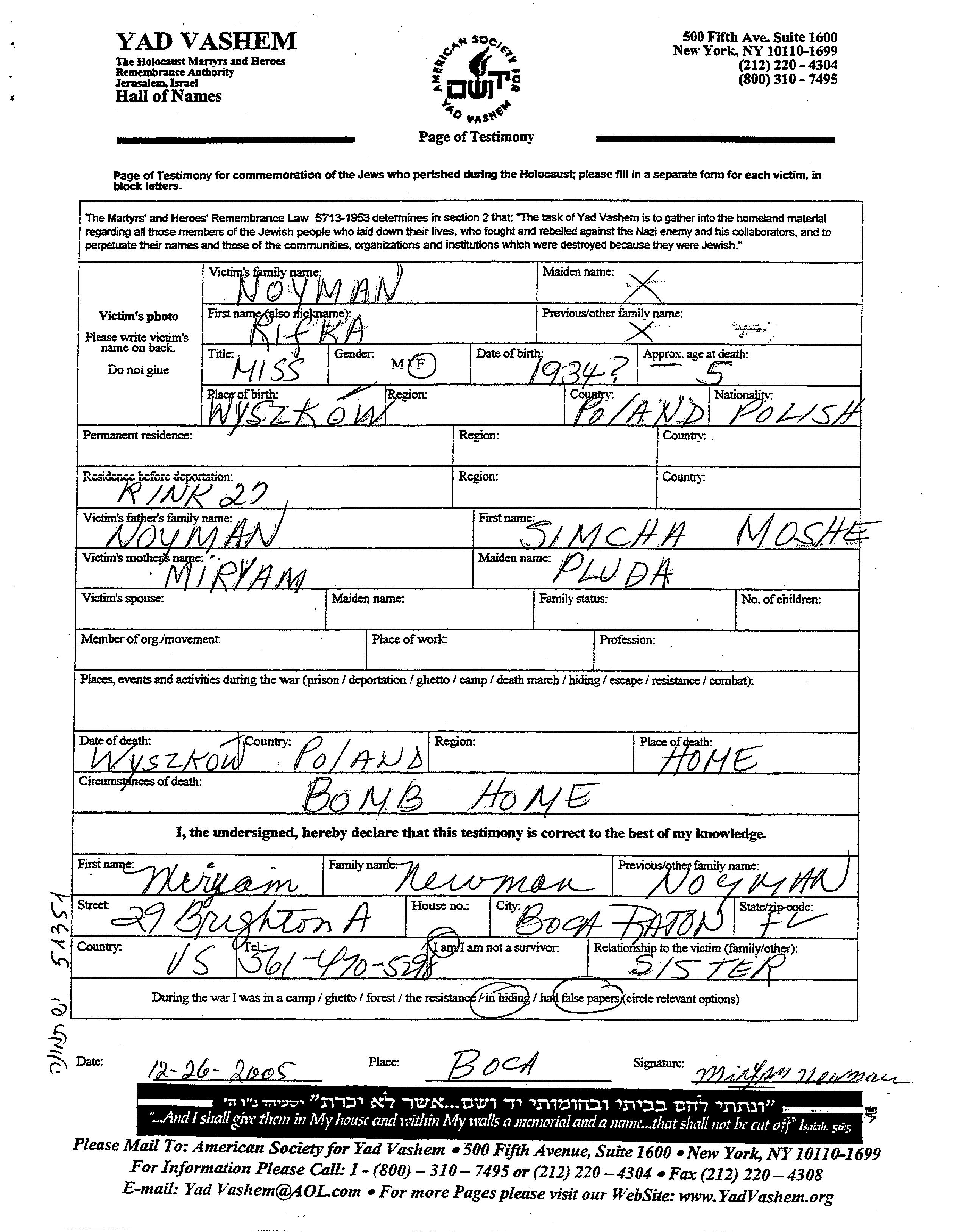Yad Vashem - Pages of Testimony Names Memorial Collection