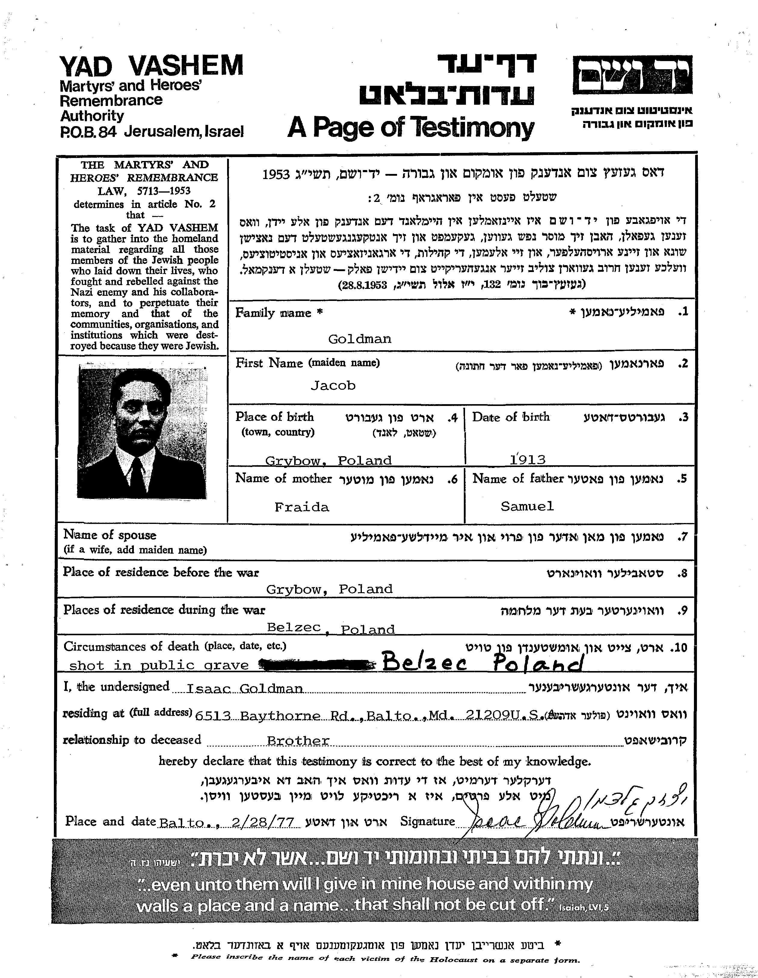 Jacob Goldman was born in Grybow, Poland, 1913. Prior to WWII he lived in Grybow, Poland.