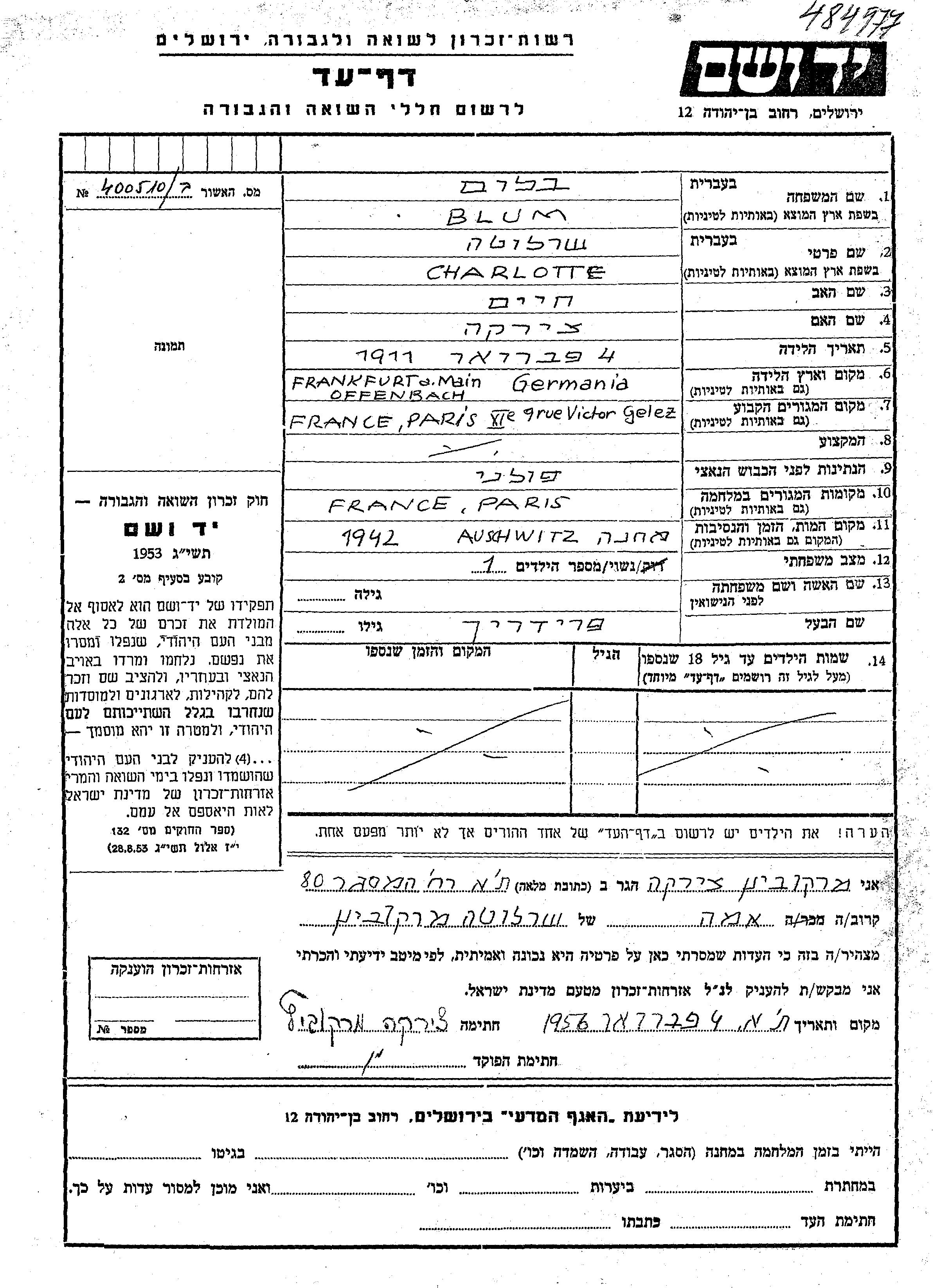 Blum Charlotte 1911 Paris, France Page of Testimony