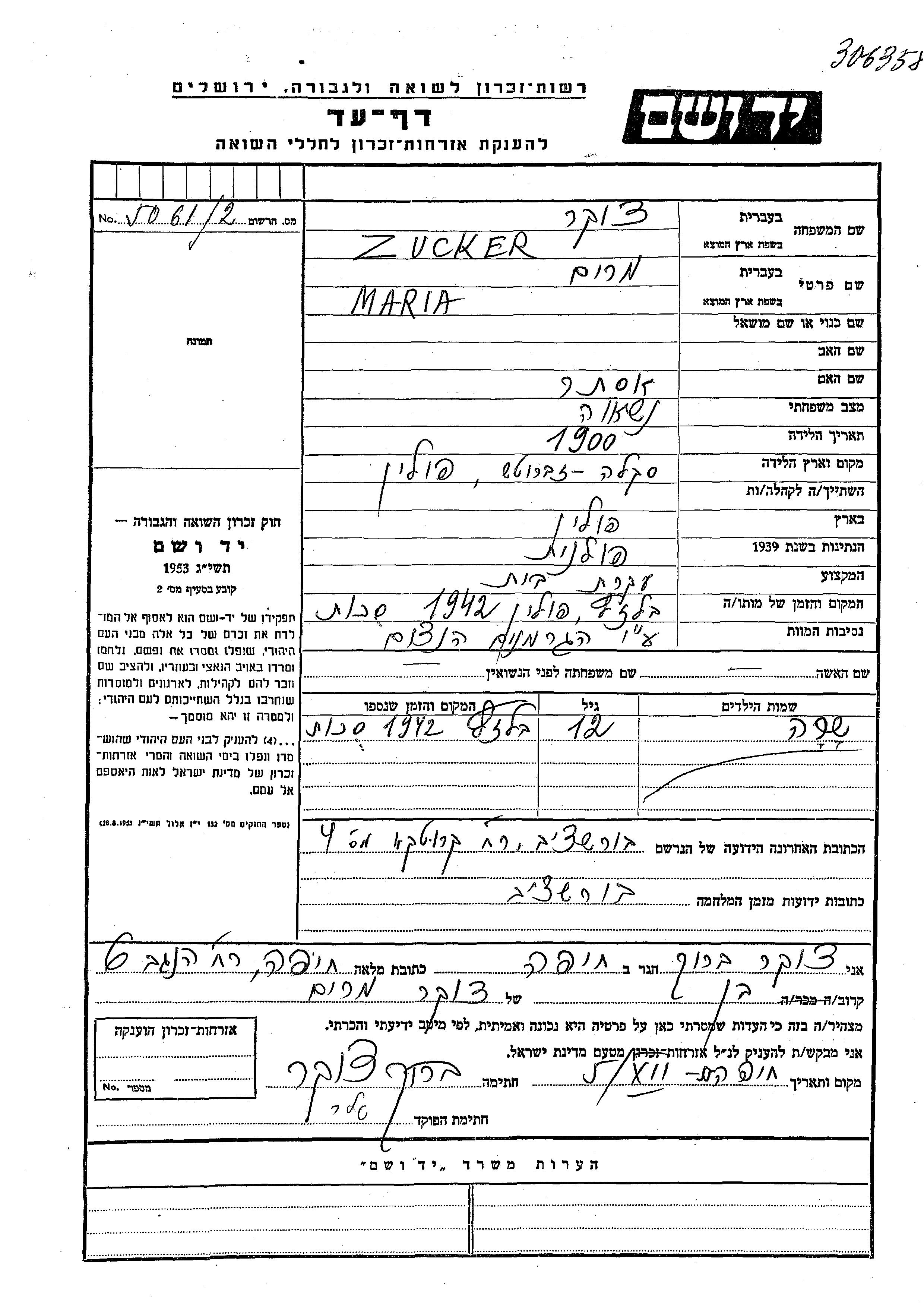 | Zucker | Maria Miriam | 1900 | Borszczow, Poland | Page of Testimony |