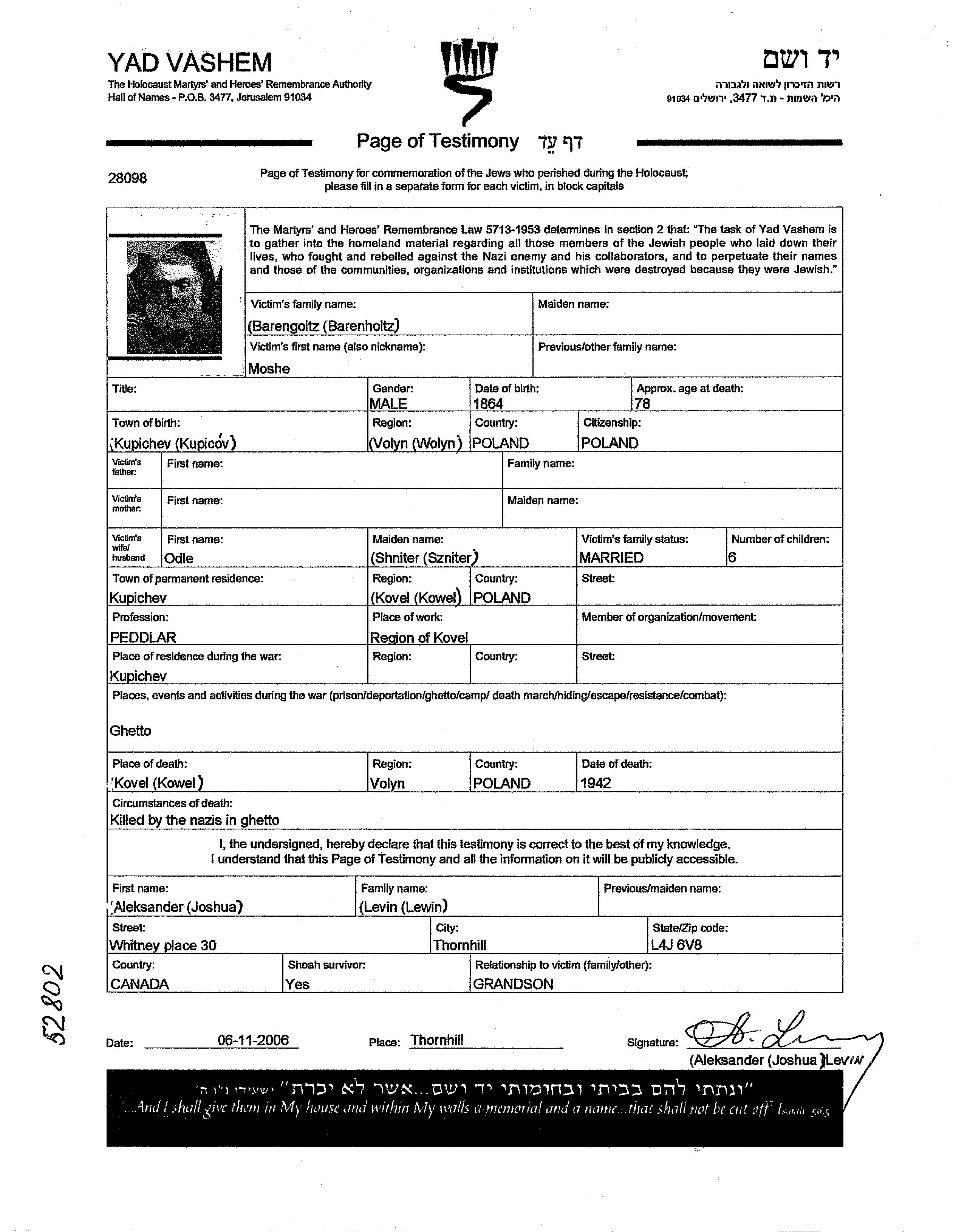 Moshe Barengoltz was born in Kupiczow, Poland, 1864. He was a peddler. Prior to WWII he lived in Kupiczow, Poland. Moshe was murdered in the Shoah. Place of death: Kowel, Poland, 1942.